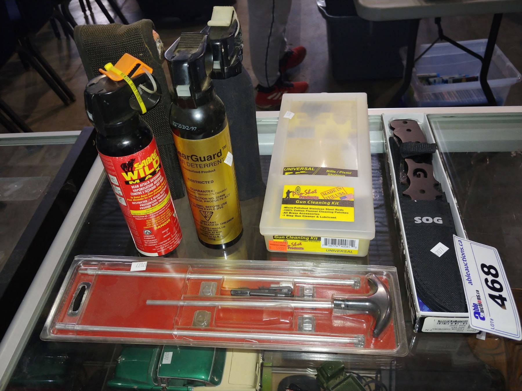 LOT INCLUDING SOG SPECIALTY KNIFE, BEAR SPRAY, RIFLE CLEANING KIT AND MORE