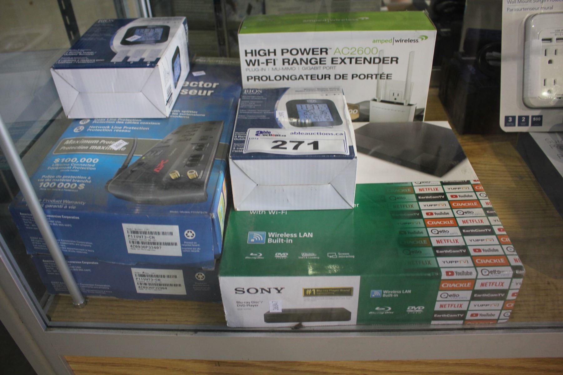 LOT INCLUDING SURGE PROTECTOR, WI-FI RANGE EXTENDER, SONY BLURAY PLAYER, AND MORE