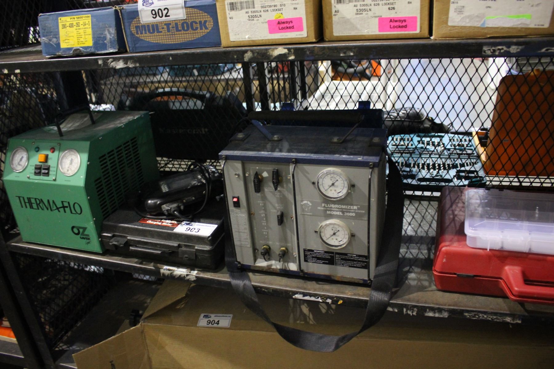 LOT INCLUDING THERMAFLOW STANDARD RECOVERY HOOKUP MODEL 4000, DIAGNOSTIC, CHARGING METER, VALVE KIT AND FLUOROMIZER OIL LESS REFRIGERANT RECOVERY SYSTEM MODEL 3600