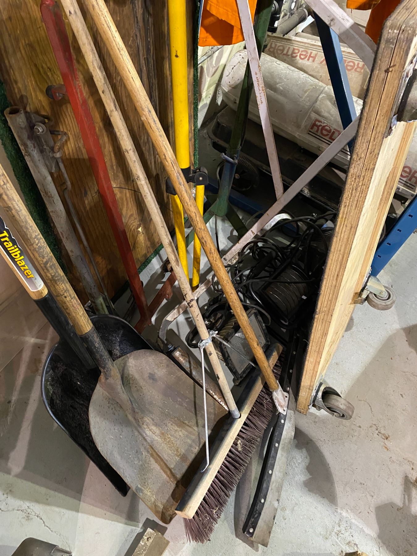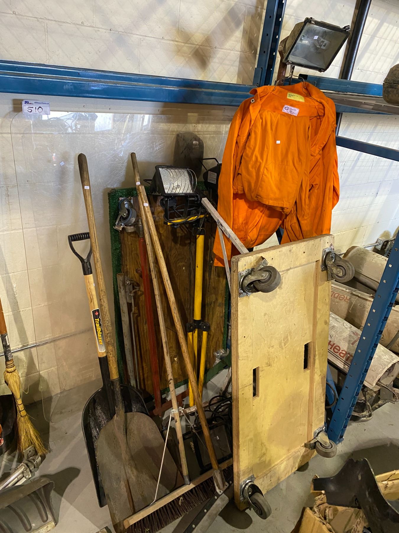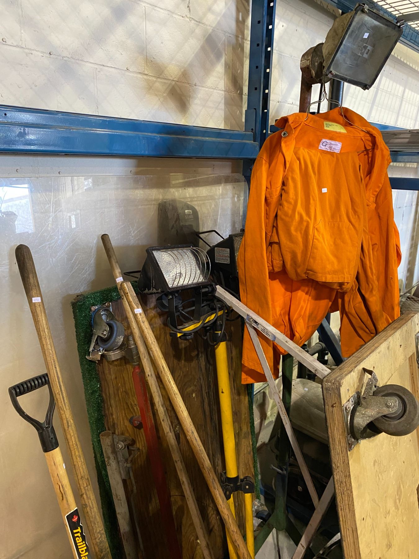LOT INCLUDING YARD TOOLS, 2 CARTS & HALOGEN LAMP STAND