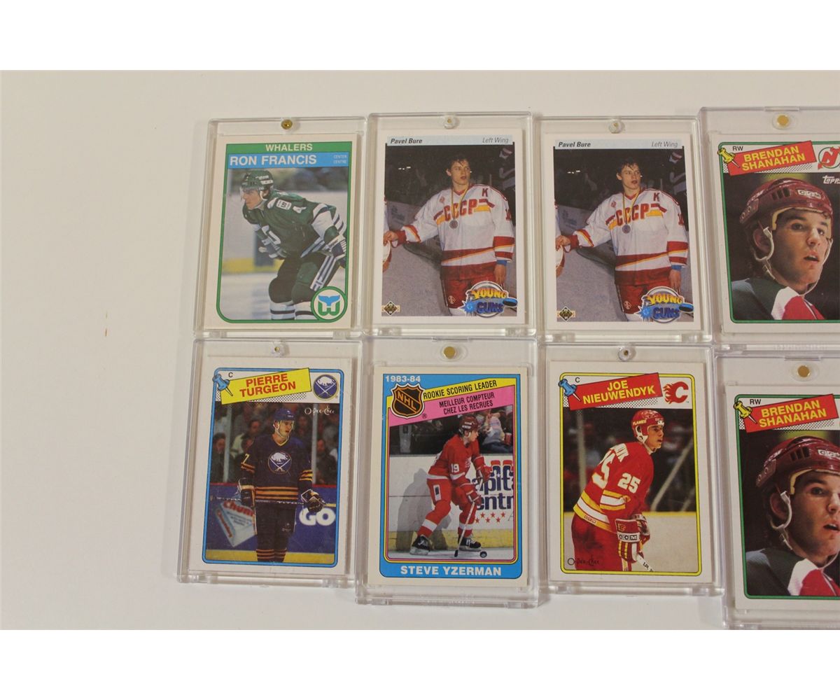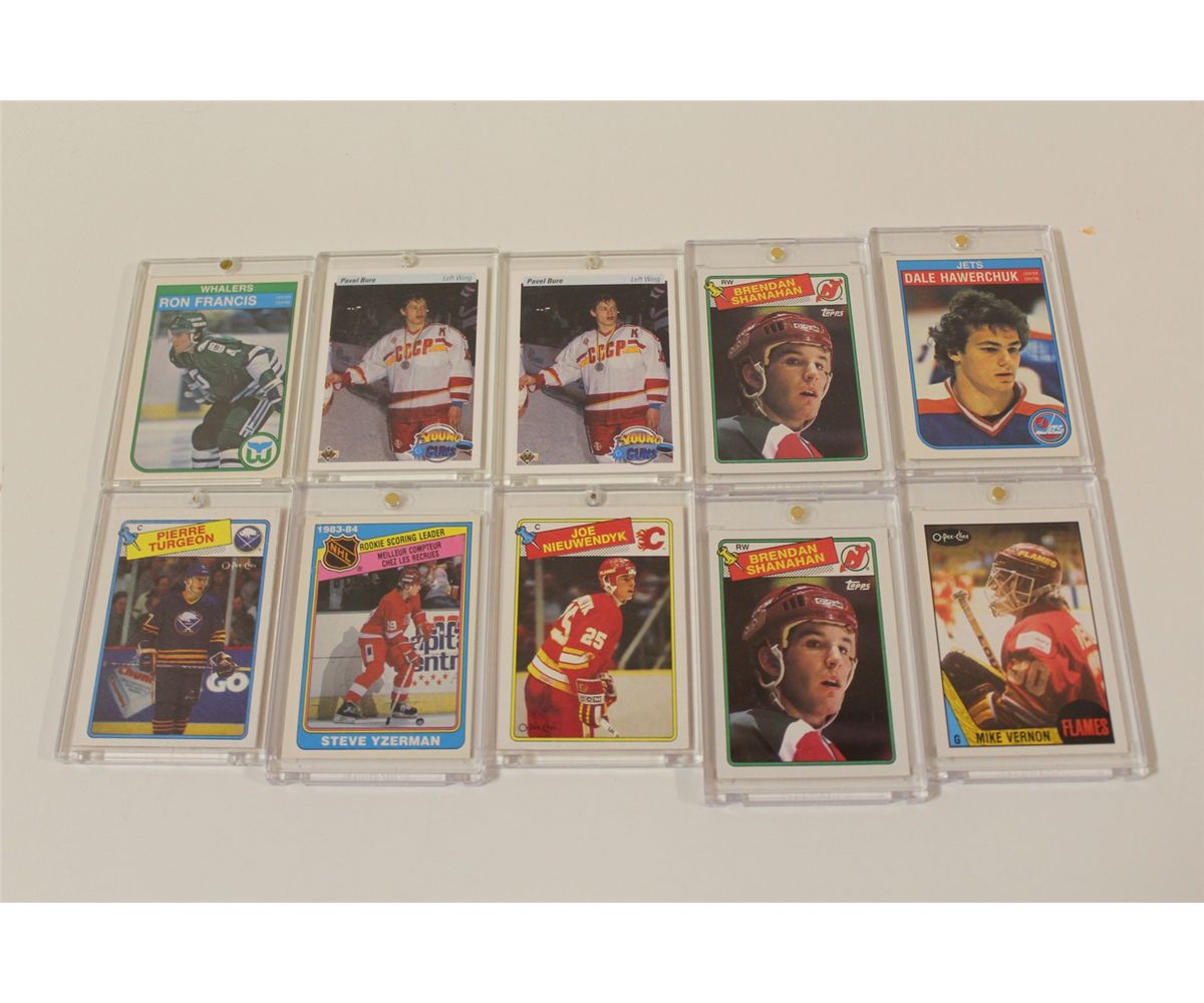 LOT OF 10 NHL ROOKIE CARDS, INCLUDES: RON FRANCIS, PIERRE TURGEON, JOE NIEUWENDYK, BRENDAN SHANAHAN, DALE HAWERCHUCK, MIKE VERNON, AND STEVE YZERMAN SCORING LEADER.