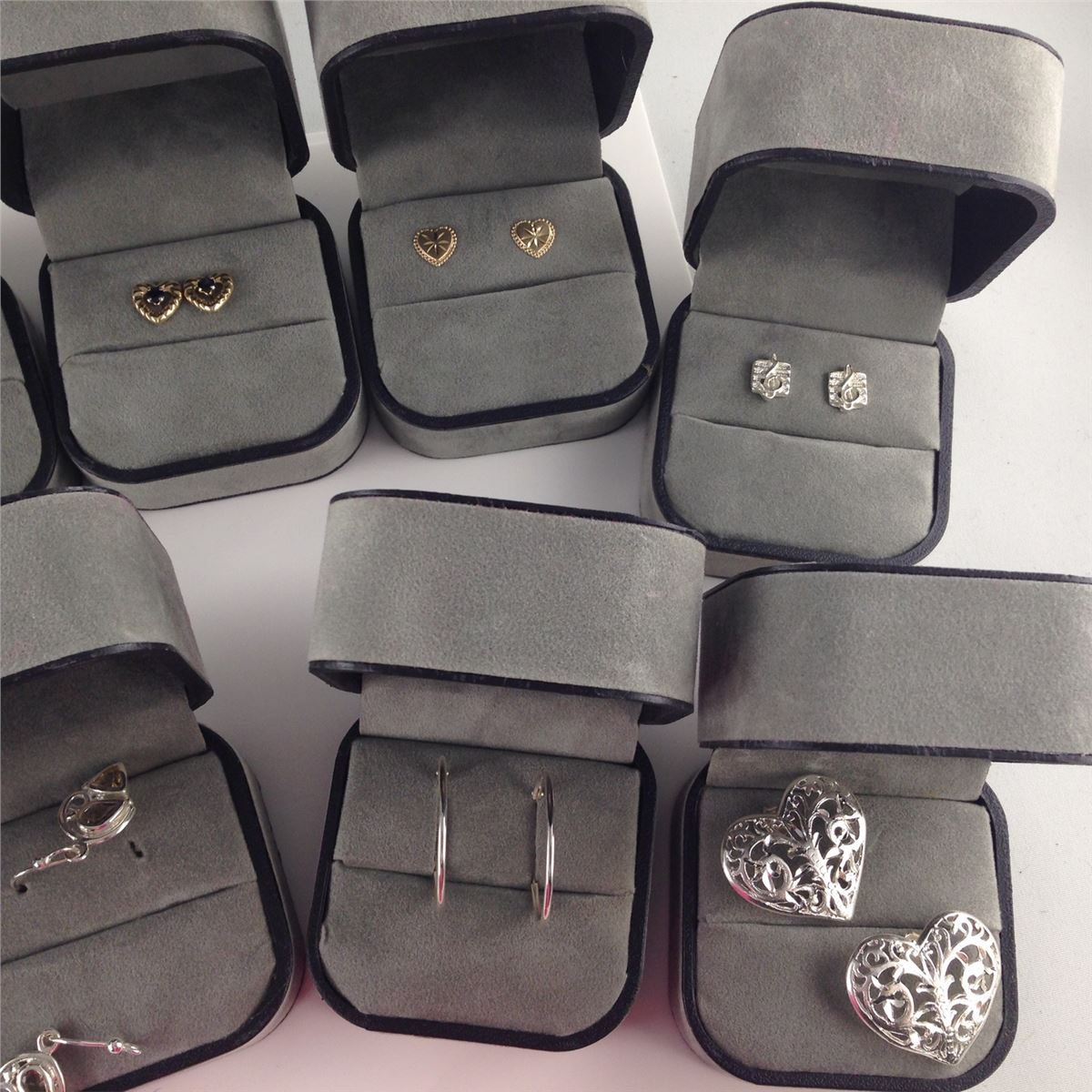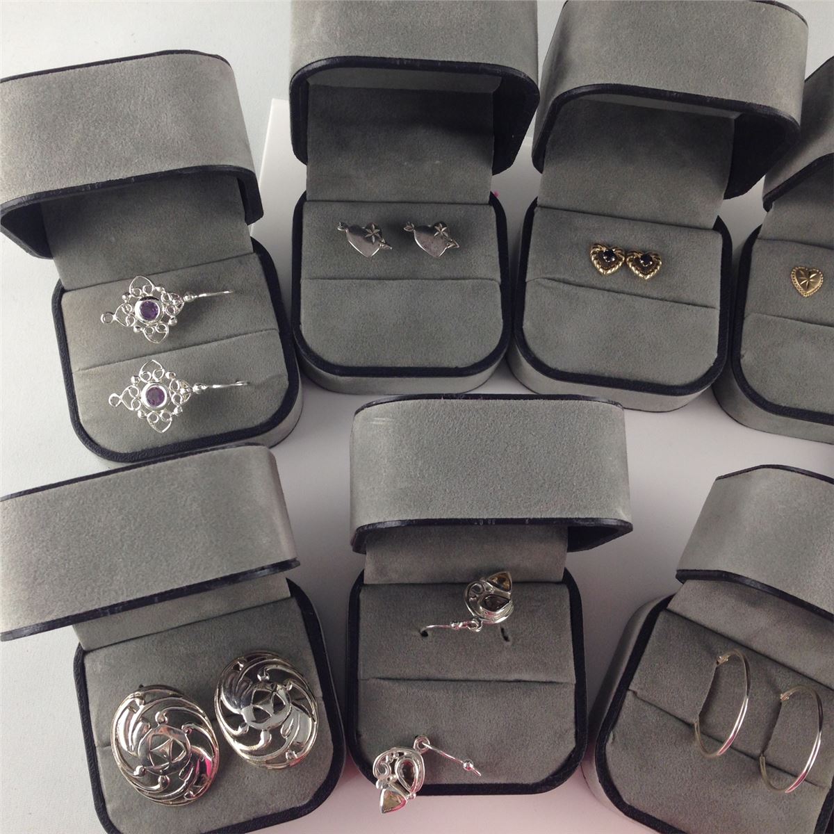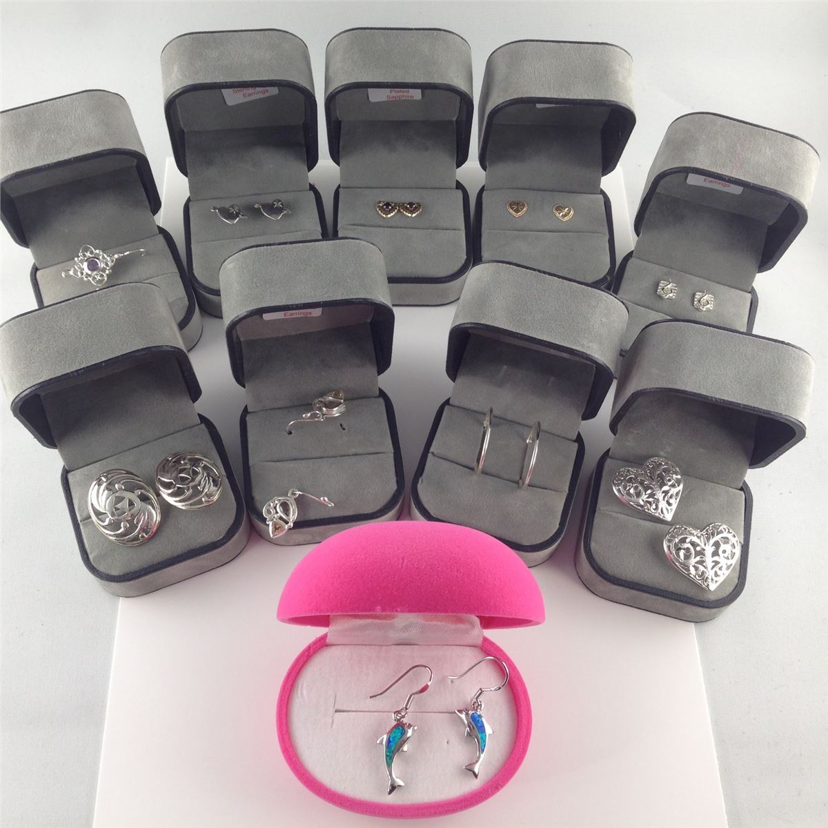 LOT OF 10 PAIRS OF STERLING SILVER EARRINGS, SOME INCLUDING: AMETHYST, SAPPHIRE, 10KT GOLD AND DOLPHIN EARRINGS. A CHOICE DEALERS LOT!