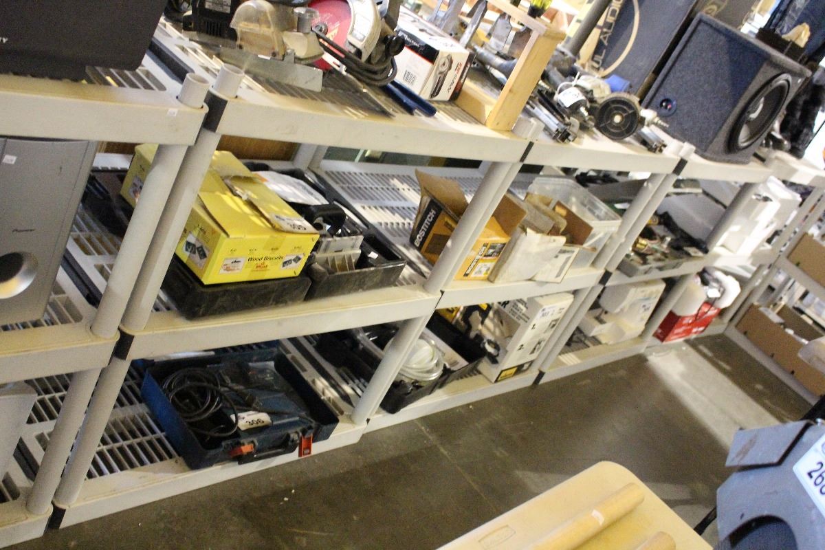 LOT OF 11 PLASTIC SHELVING UNITS INCLUDING EXTRA POLES
