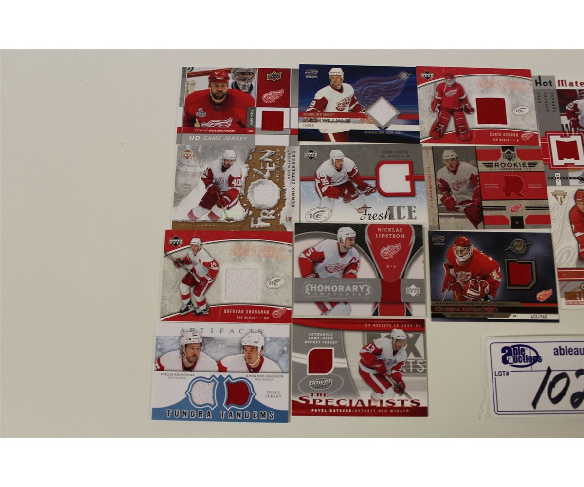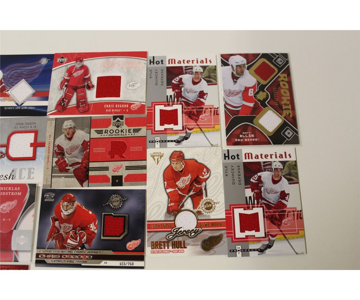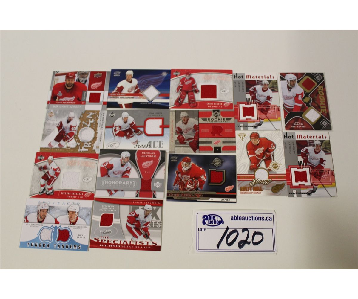 LOT OF 15 DETROIT RED WINGS AUTHENTIC MEMORABILIA CARDS INCLUDING: P. DATSYUK, N. LIDSTROM, J. FRANZEN, H. ZETTERBERG, B. SHANNAHAN, N. KRONWALL, B. HULL AND MORE!