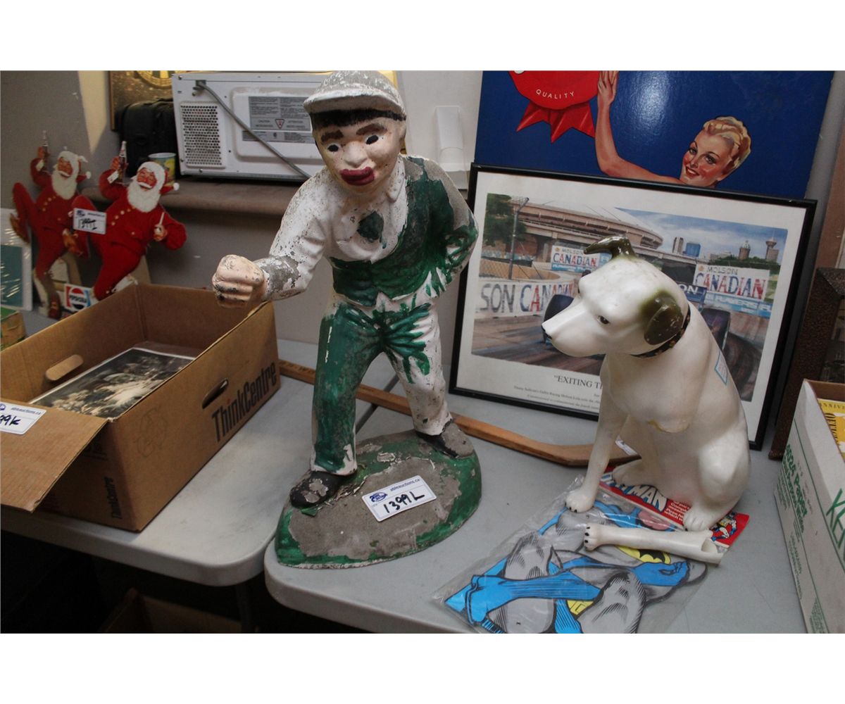 LOT OF 1960'S RCA, VICTOR STORE DISPLAY INC. NIPPED THE DOG (BROKEN), 1970'S JOINT ACTION BATMAN,AND 1950'S CEMENT BASEBALL PLAYER