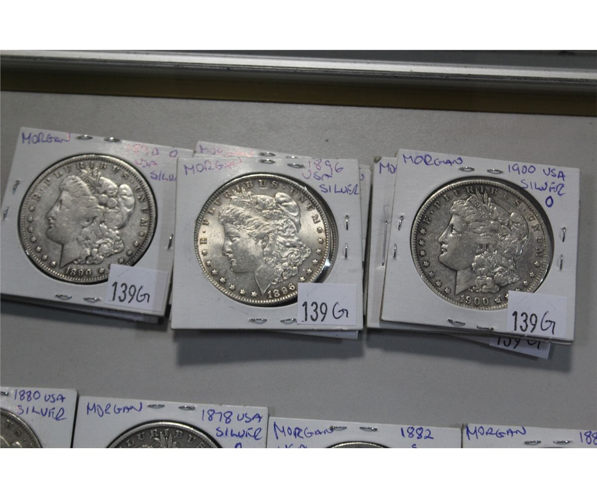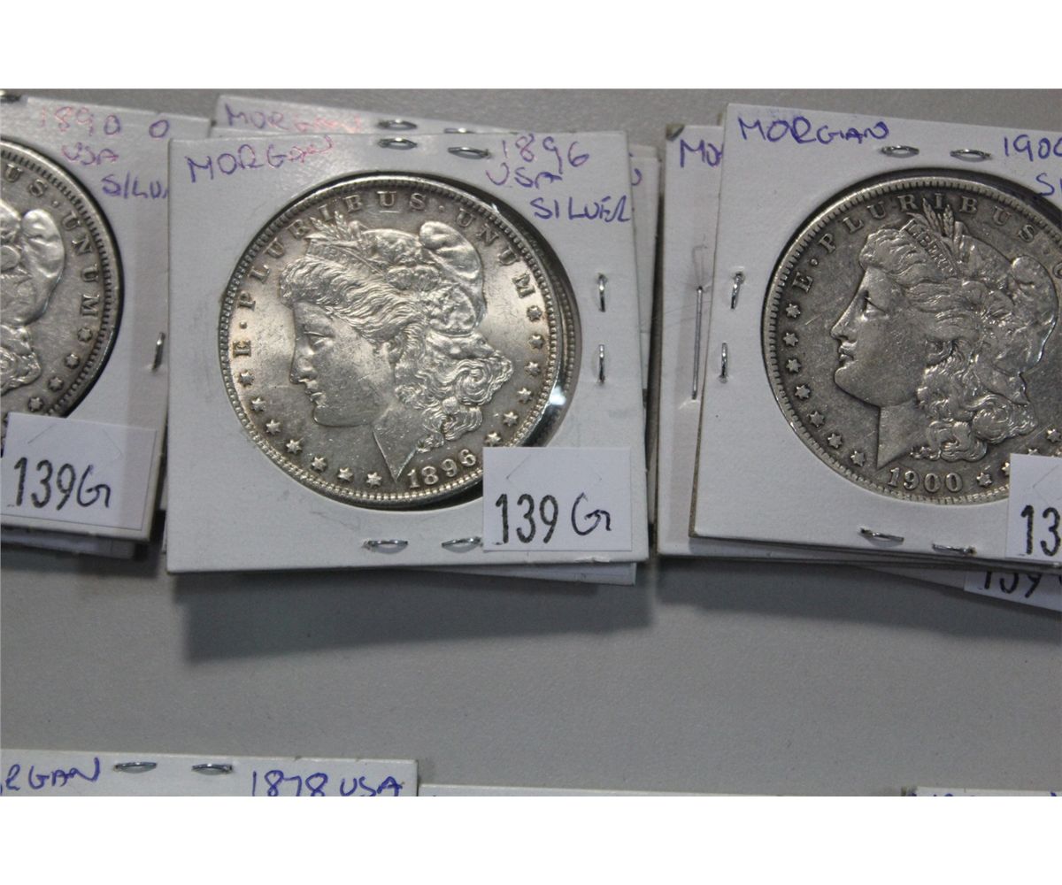 LOT OF 2- 1890 US MORGAN SILVER DOLLARS + 3- 1896 US MORGAN SILVER DOLLARS + 1900 US MORGAN SILVER DOLLAR AND 2- 1922 US MORGAN SILVER DOLLAR. 8 COINS TOTAL