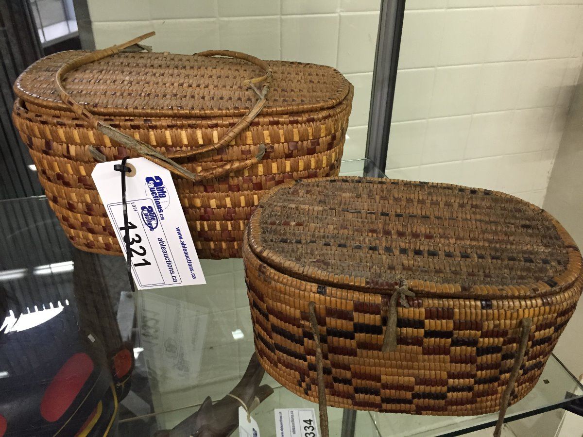 LOT OF 2 LIDDED SALISH BASKETS 14" X 7" X 8" AND 10" X 6" X 5"