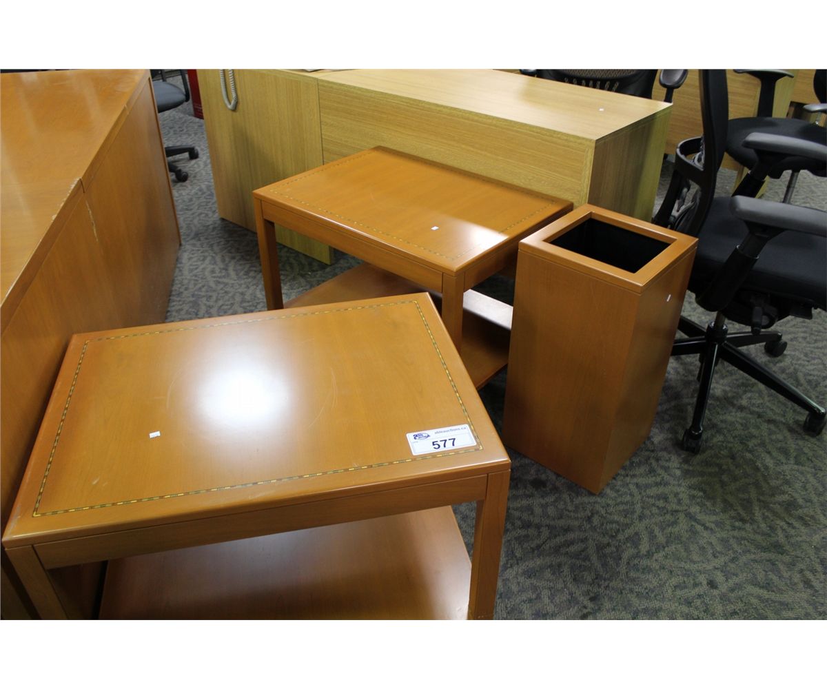LOT OF 2 LIGHT CHERRY END TABLES AND UMBRELLA STAND
