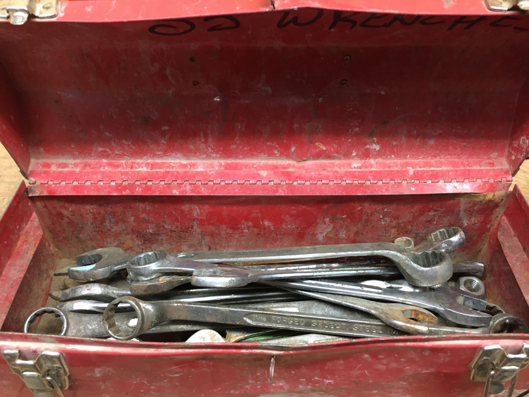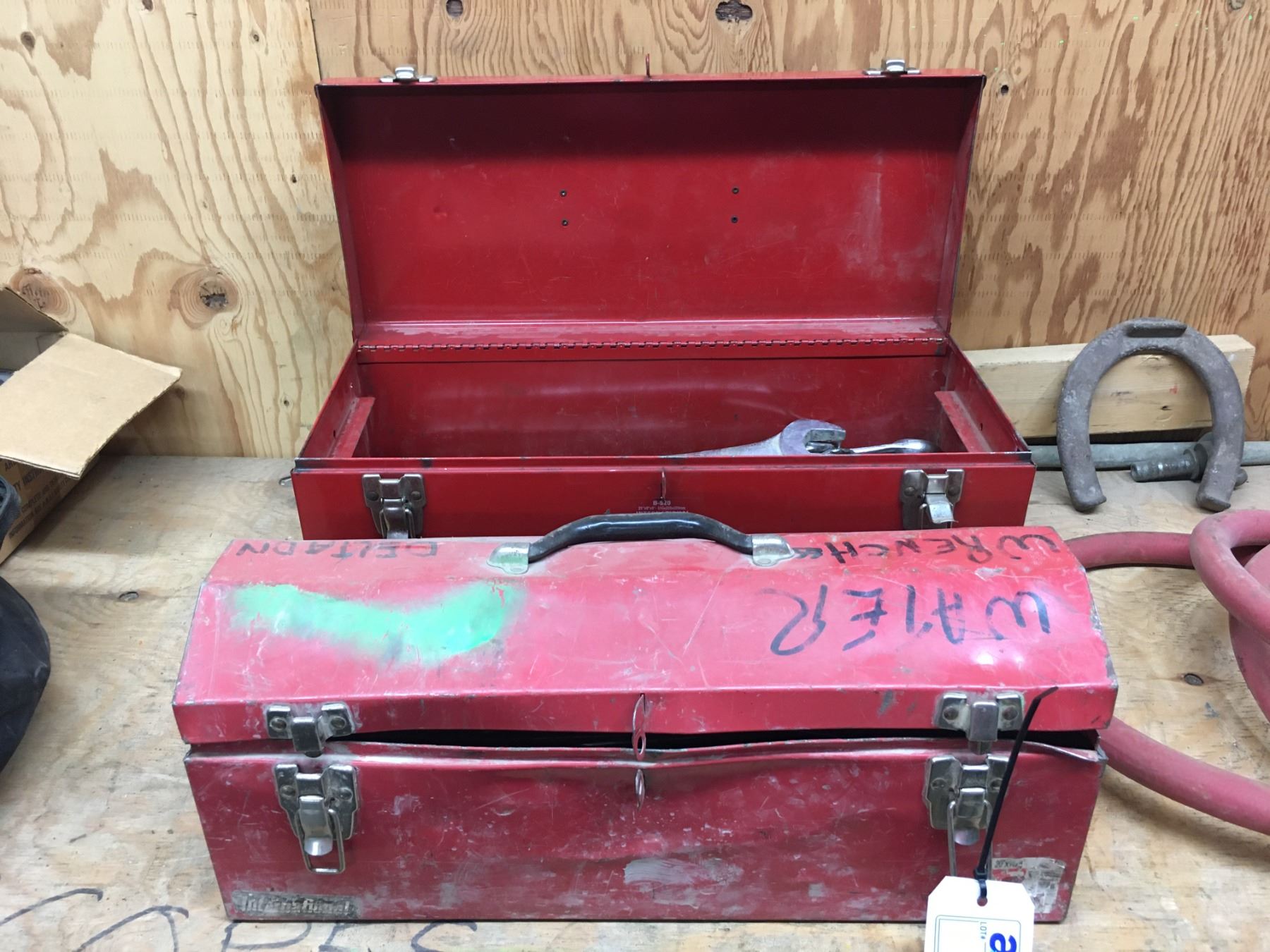 LOT OF 2 RED METAL TOOL BOXES FULL OF ASSORTED WRENCHES