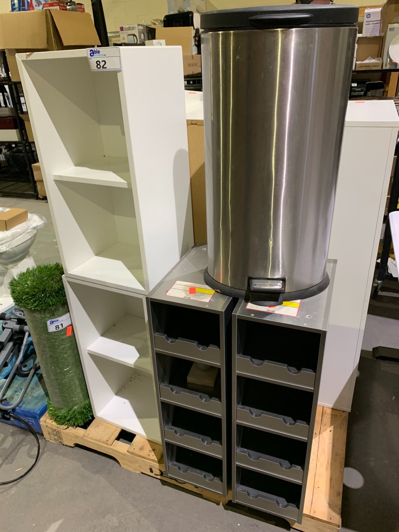 LOT OF 2 WHITE SHELVING UNITS, GARBAGE CAN AND MORE