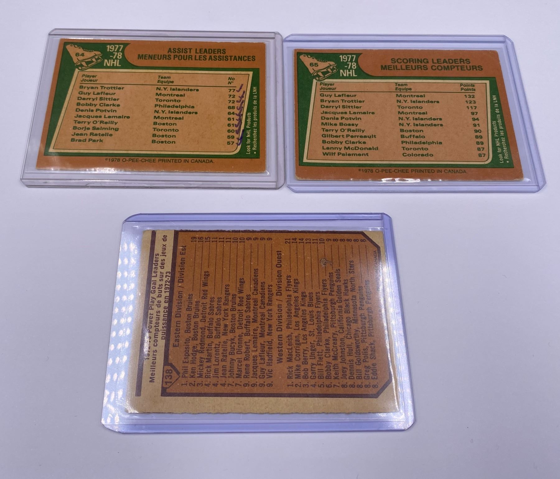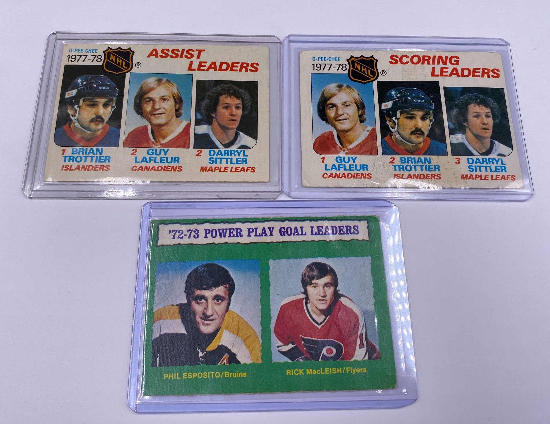 LOT OF 3 70'S ERA HOCKEY CARDS; 72-73 POWER PLAY GOAL LEADERS, 77-77 SCORING LEADERS, 77-78 ASSIST