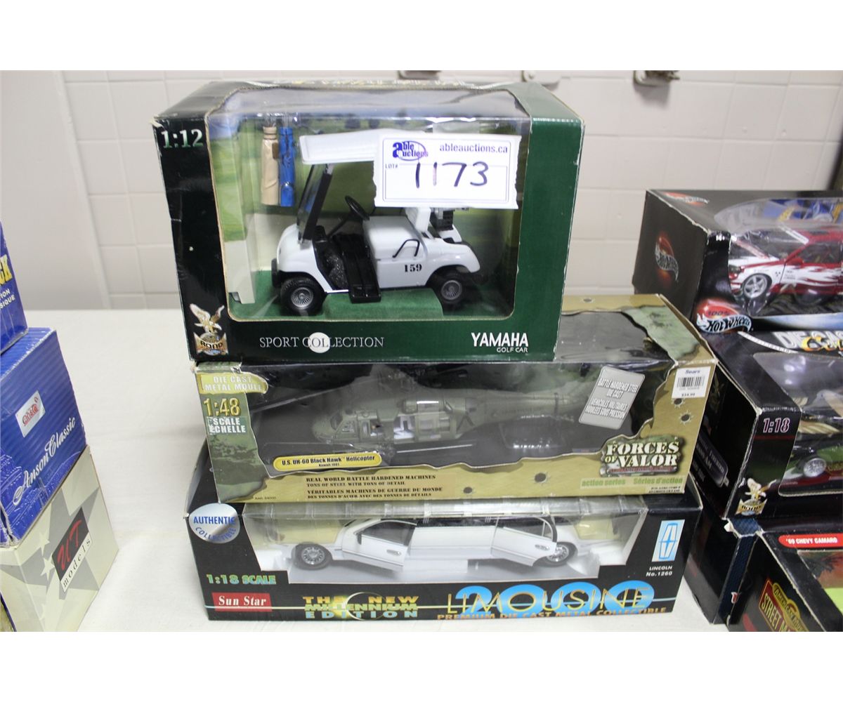 LOT OF 3-  ASSORTED DIE CAST INCLUDING GOLF CART, LIMO AND FORCES OF VALOR