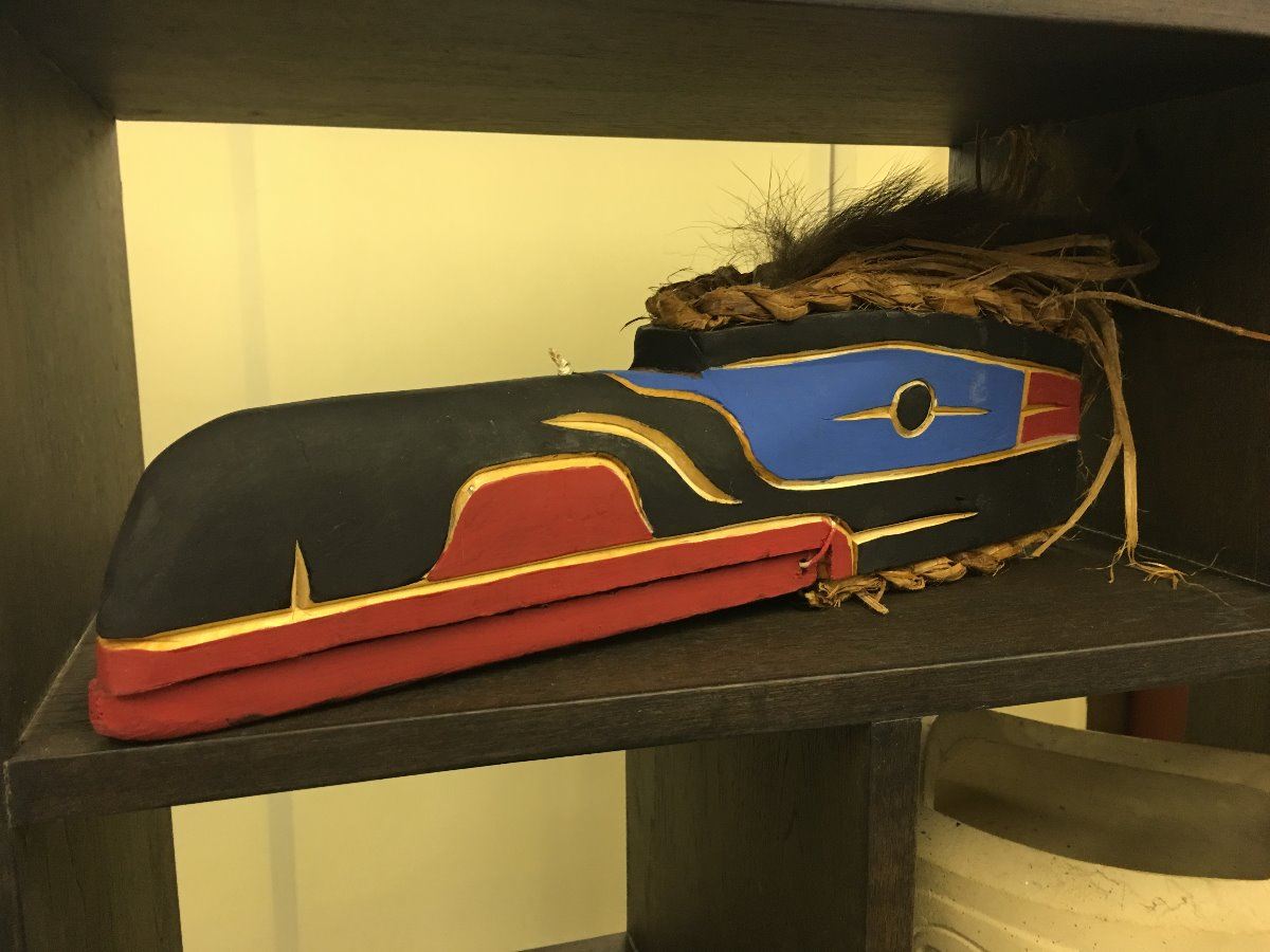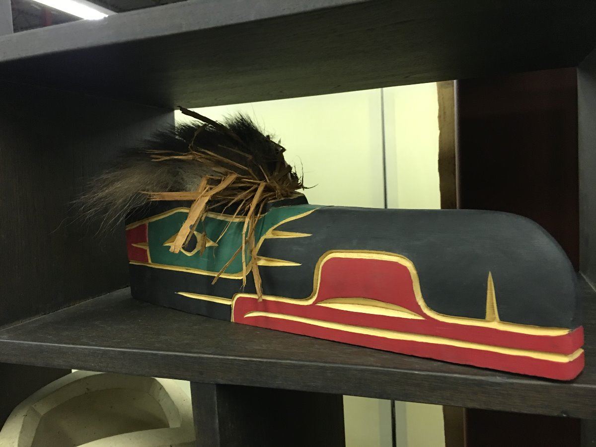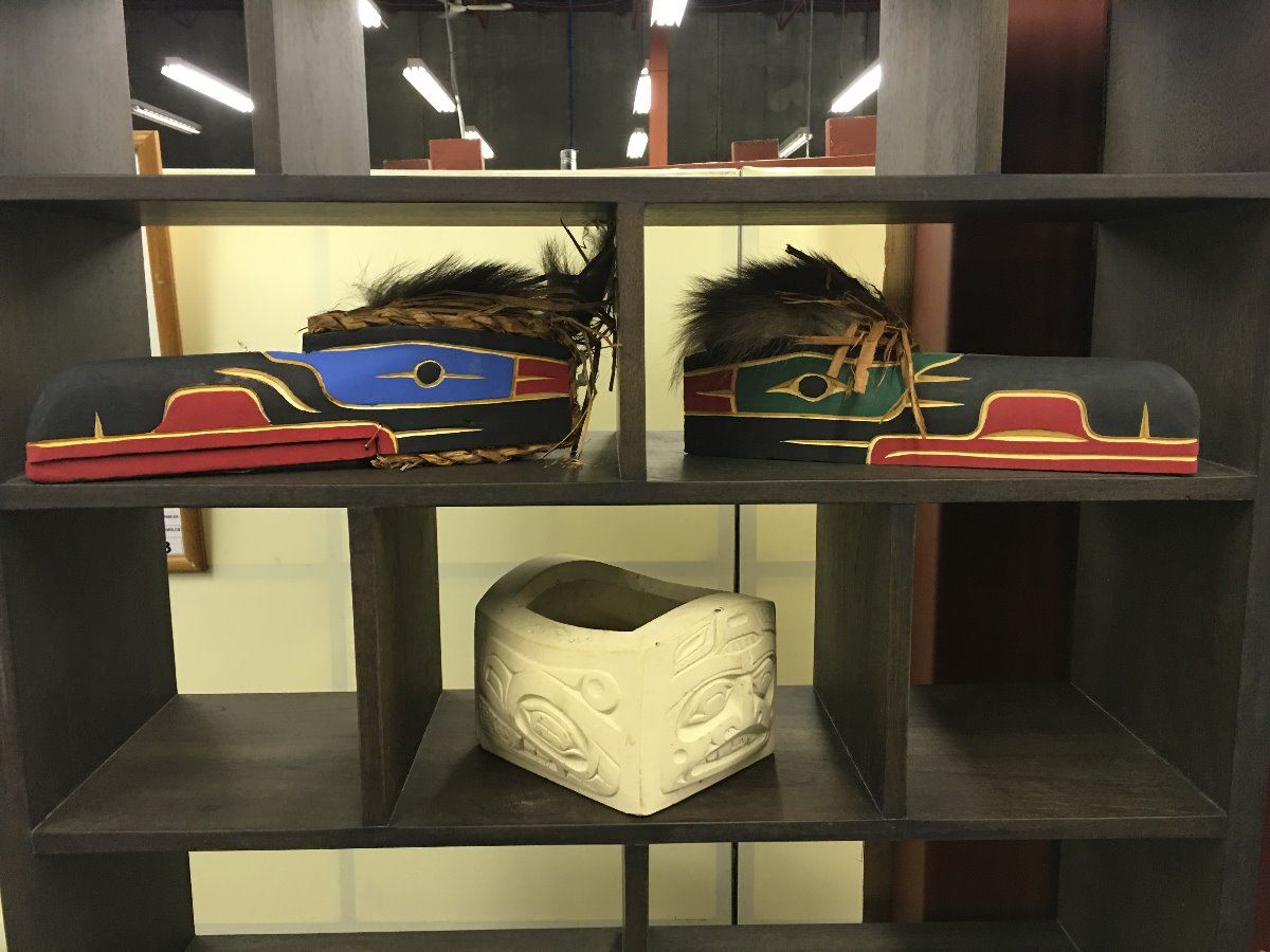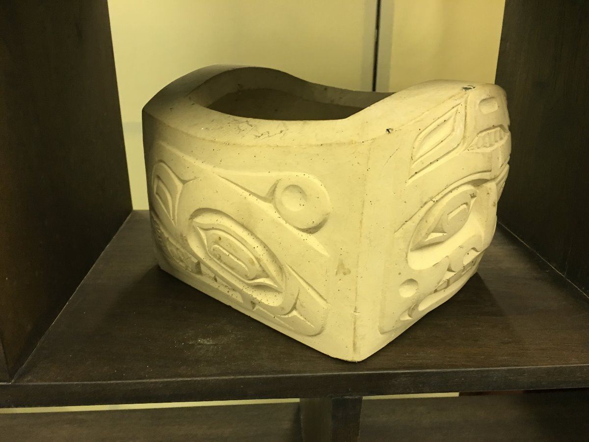 LOT OF 3 BC FIRST NATIONS ITEMS. 2 RAVEN MASKS AND A CARVED STONE BOWL