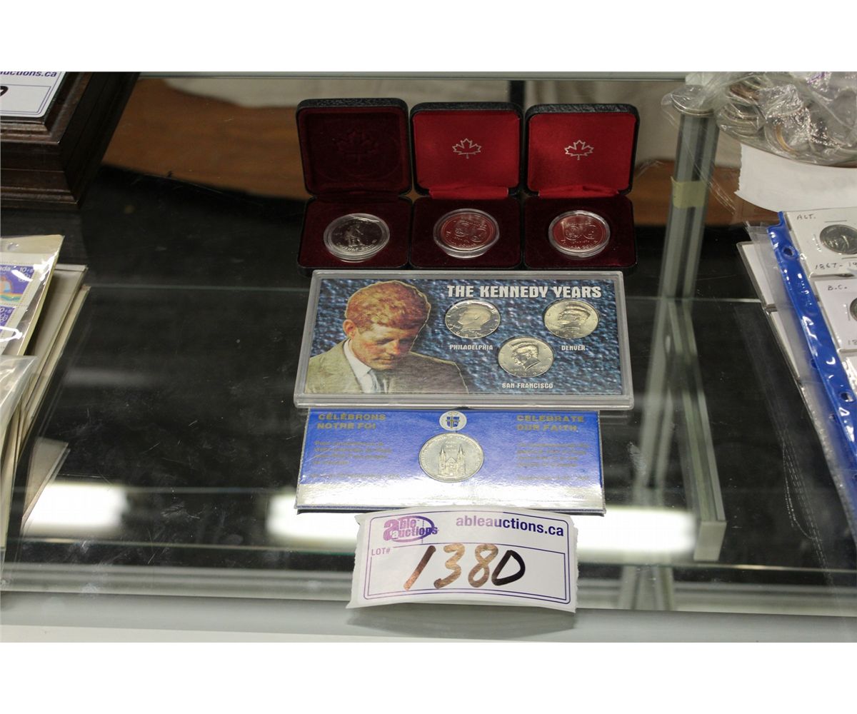 LOT OF 3 COMMEMERATIVE CANADIAN DOLLAR COINS, THE KENNEDY YEARS 3 USA HALF DOLLARS, 1984 CELBRATE OUR FAITH COMMEMERATIVE COIN