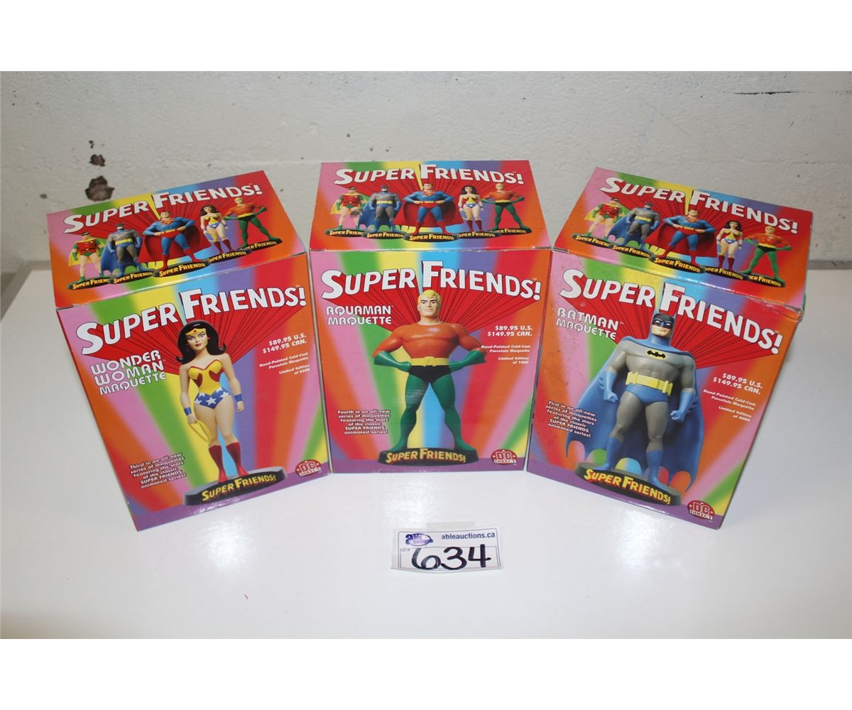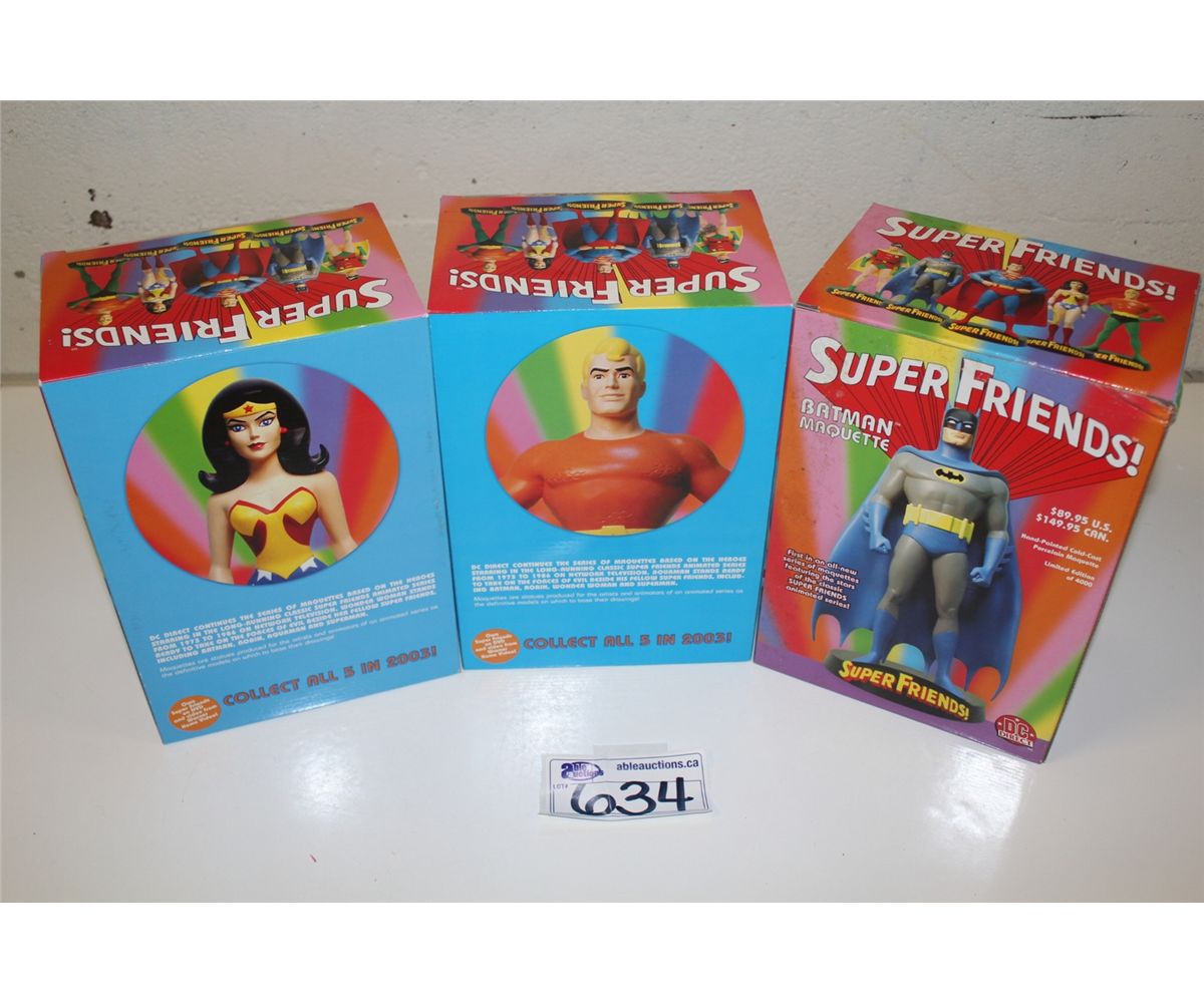 LOT OF 3 DC DIRECT SUPER FRIENDS, LIMITED EDITION STATUES, INCLUDING WONDER WOMAN, AQUAMAN AND BATMAN NEW IN BOX.