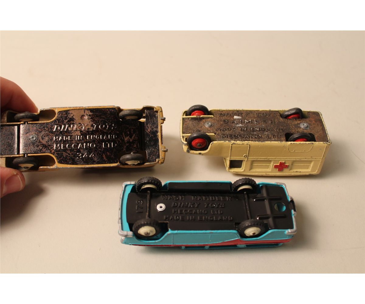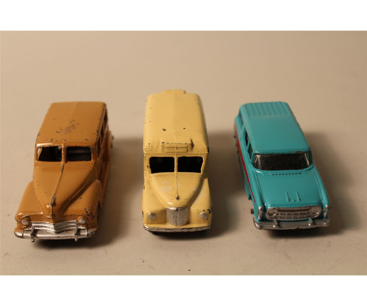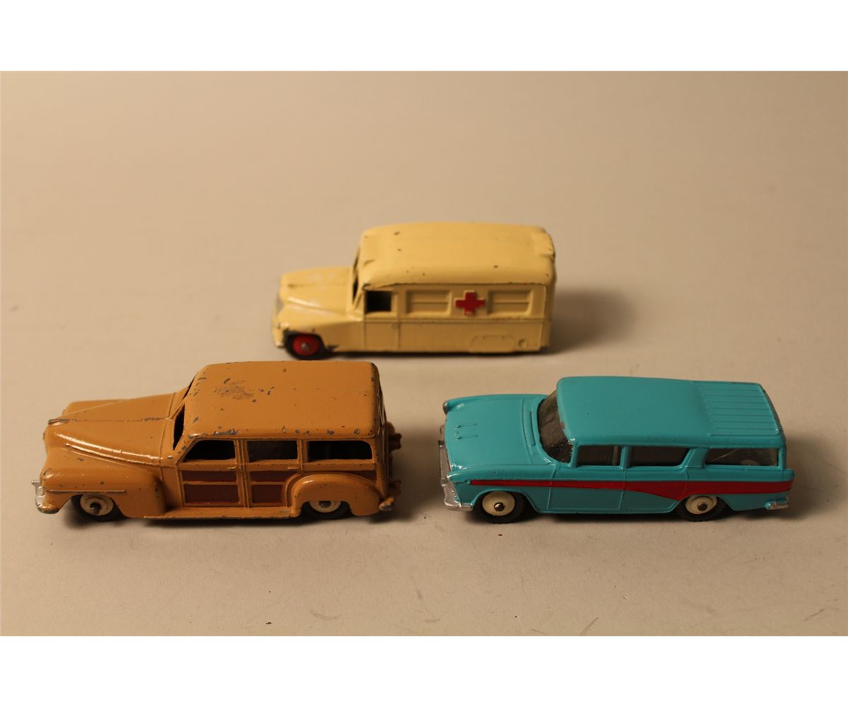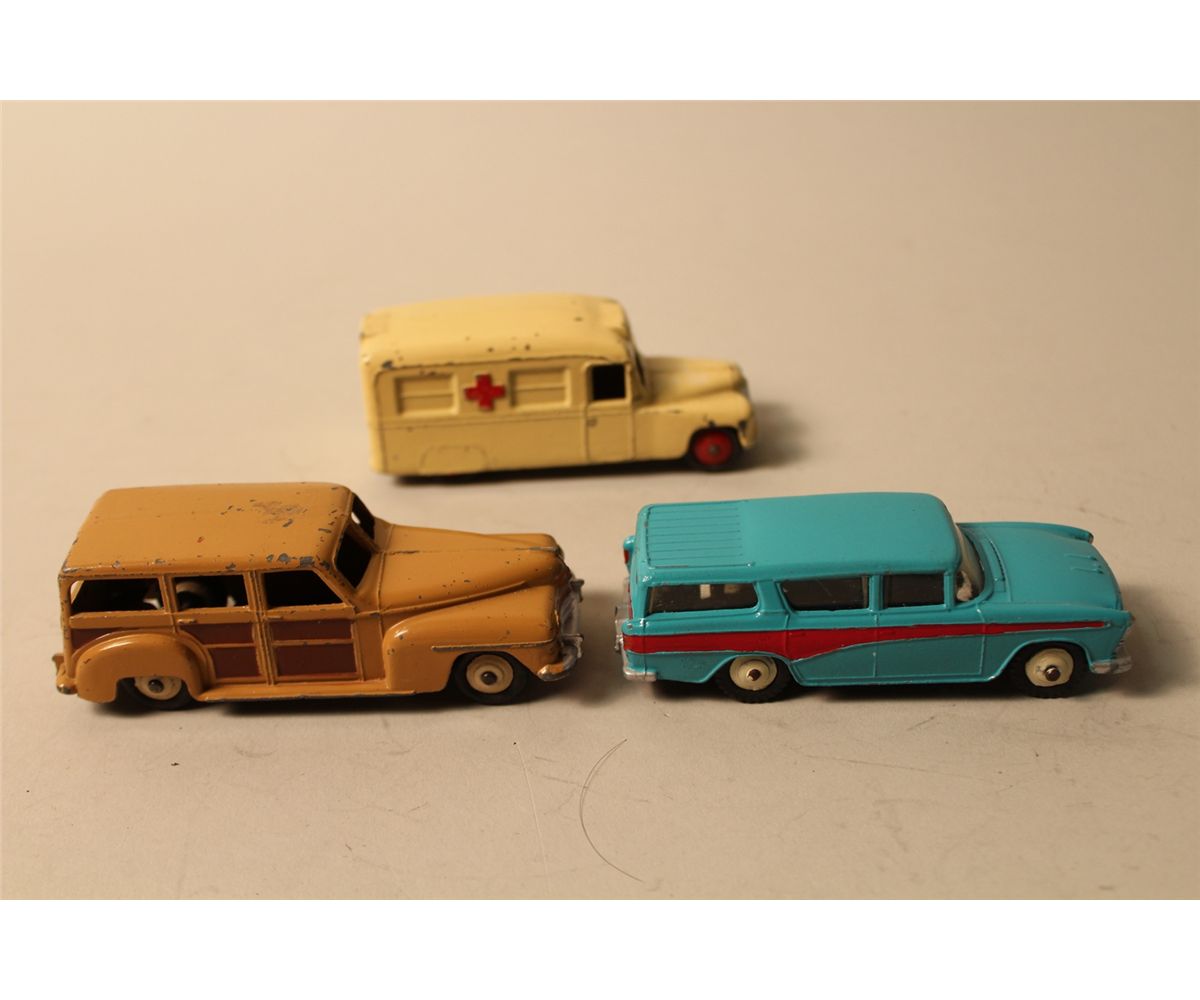 LOT OF 3 DINKY WAGONS INCL. NO. 173 NASH RAMBLER, NO. 344 "WOODY" AND NO. 253 AMBULANCE