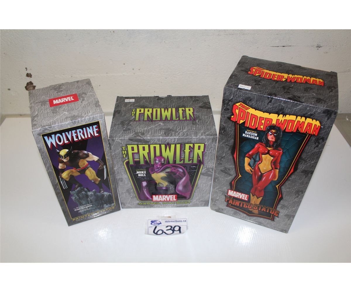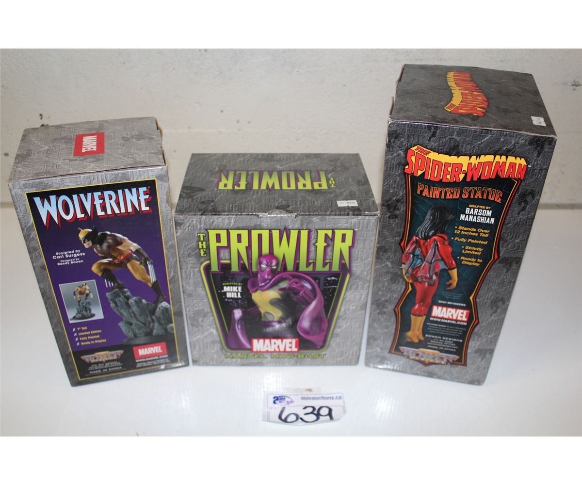LOT OF 3 LIMITED EDITION MARVEL SUPER HERO STATUES NEW IN BOX. INCLUDING, THE PROWLER MINI-BUST, WOLVERINE SMALL SCALE VERSION AND THE SPIDER-WOMAN