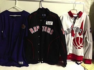 LOT OF 3 NBA GARMENTS INC: 2 TORONTO RAPTORS JACKETS AND L A LAKERS SHIRT