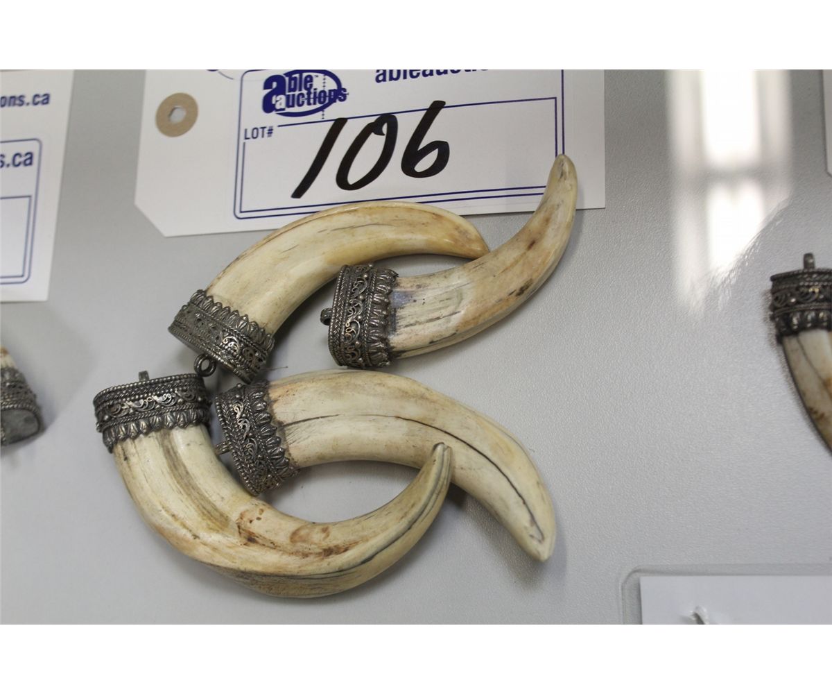 LOT OF 4- AFRICAN WARTHOG TUSK PENDANTS WITH SILVER FILIGREE