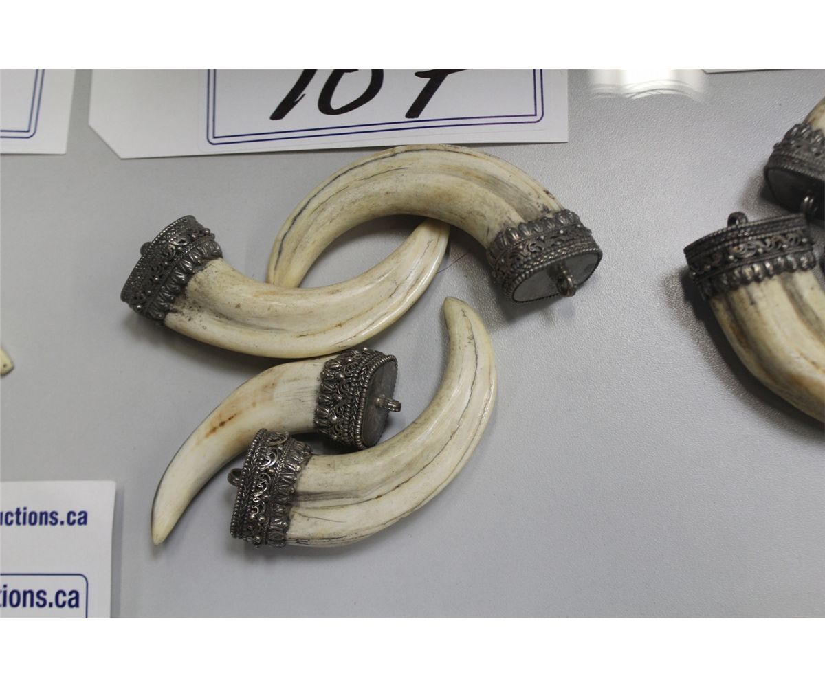 LOT OF 4- AFRICAN WARTHOG TUSK PENDANTS WITH SILVER FILIGREE