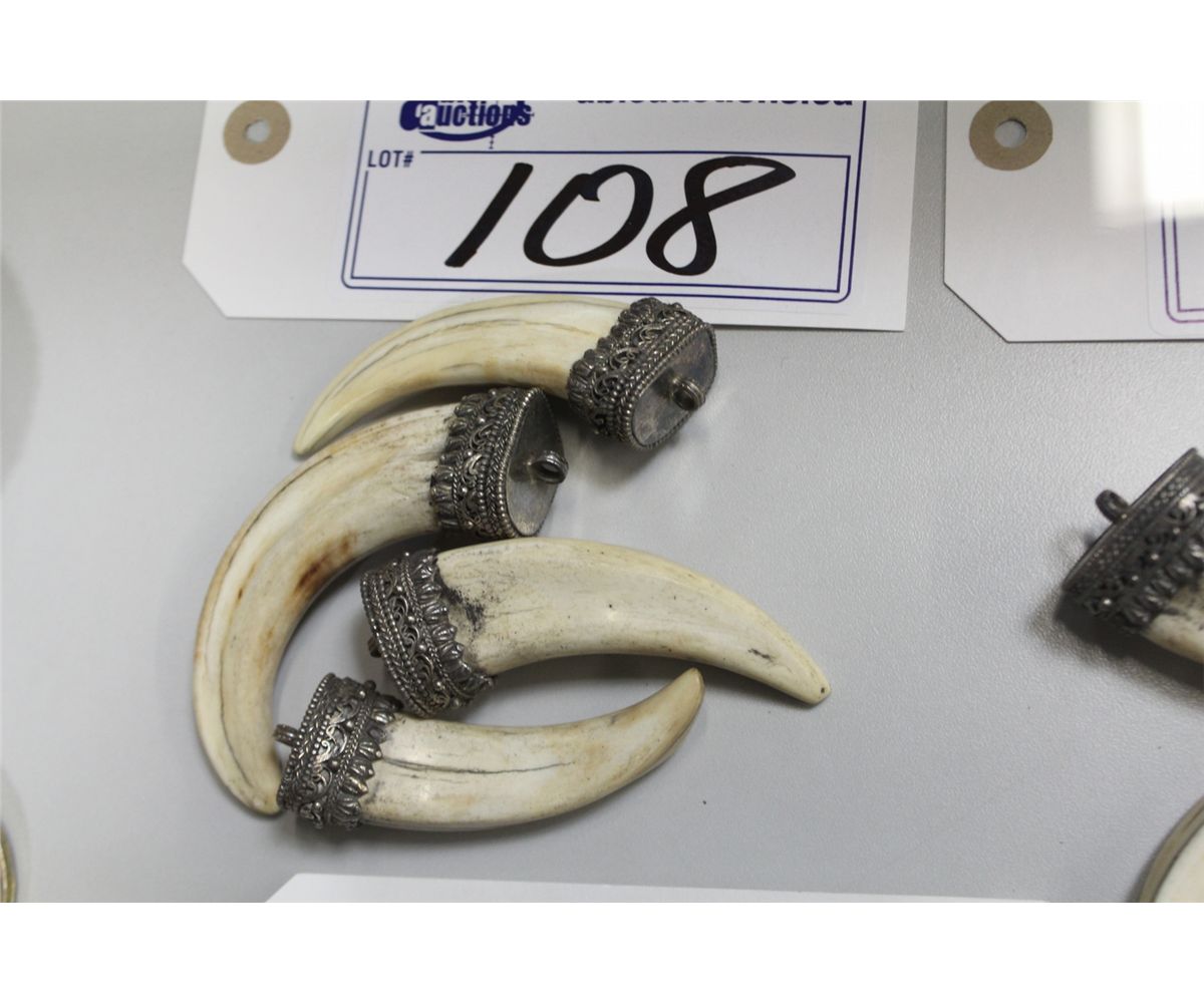 LOT OF 4- AFRICAN WARTHOG TUSK PENDANTS WITH SILVER FILIGREE