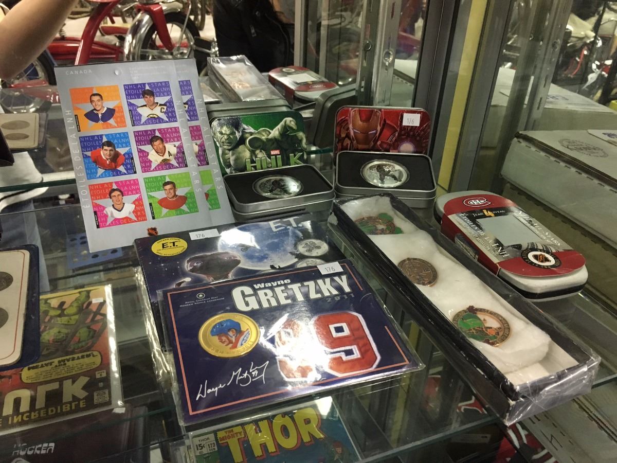 LOT OF 4 ASSORTED MARVEL COLLECTOR COINS, NHL STARS STAMP/MEDALLION SET & ASSORTED COINS