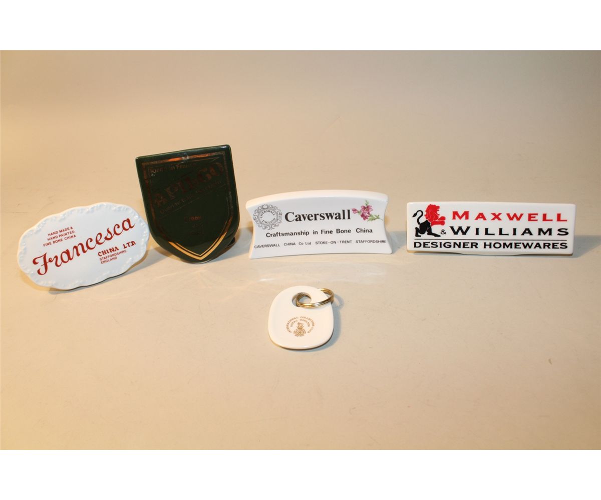 LOT OF 4 CHINA SIGNS AND KEY RING INCL. FRANCESCA, APILCO, CAVERSWALL AND WAXWELL & WILLIAMS