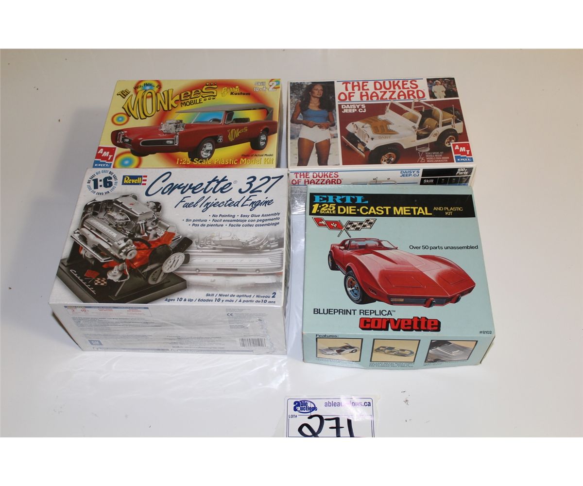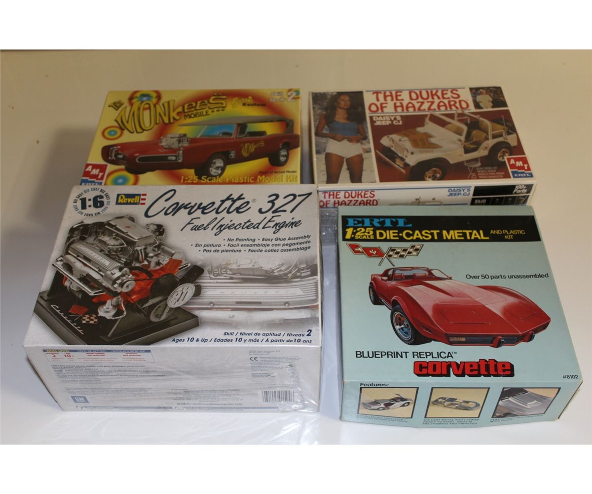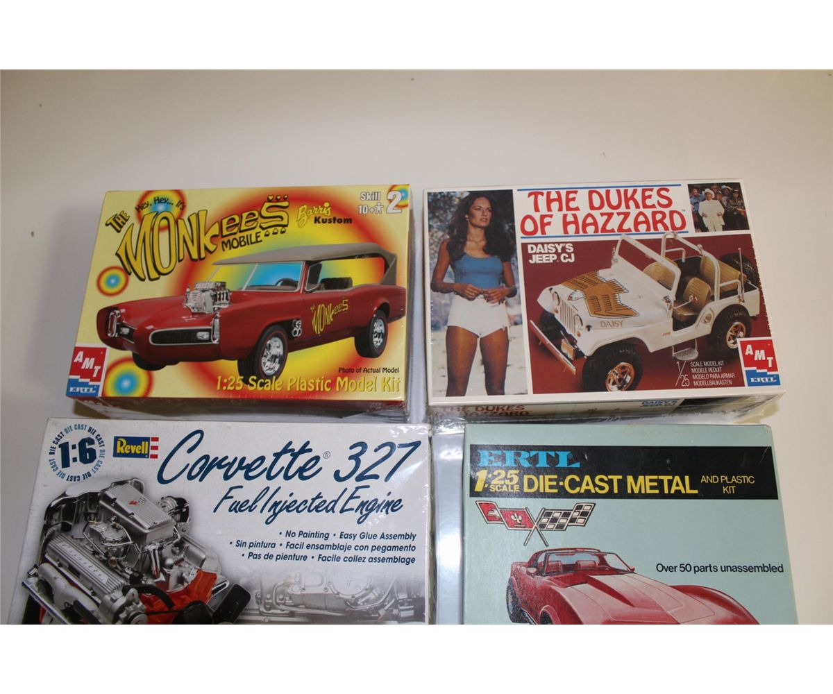LOT OF 4 DIE-CAST MODEL KITS NEW IN BOX INCLUDING THE DUKES OF HAZZARD, THE MONKEES MOBILE, CORVETTE 327 ENGINE AND CORVETTE