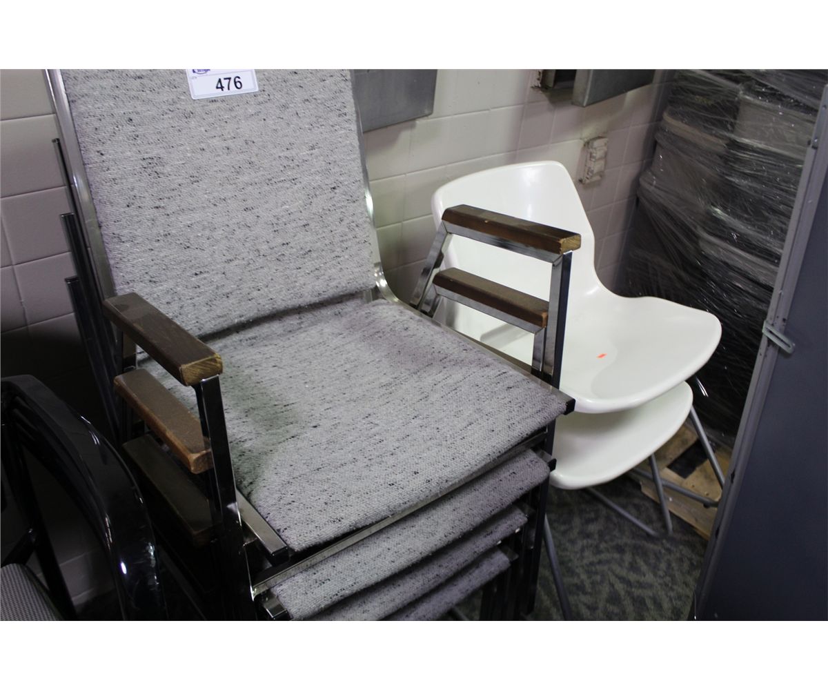 LOT OF 4 GREY STACKING CHAIRS AND 2 PLASTIC CHAIRS