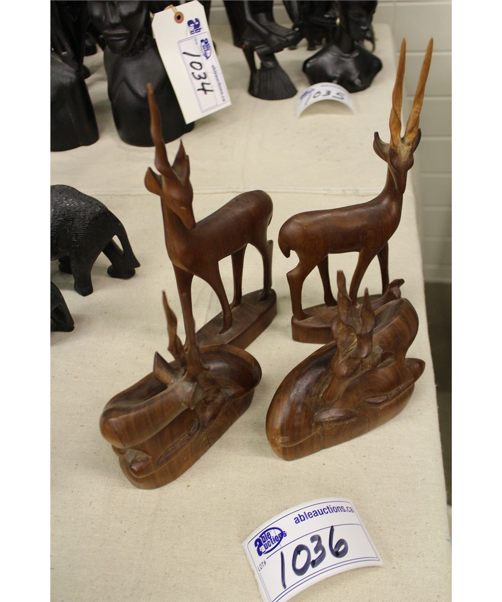 LOT OF 4 HAND CARVED WOODEN GAZELLES- 2 SITTING, 2 STANDING (ONE WITH BROKEN HORN)
