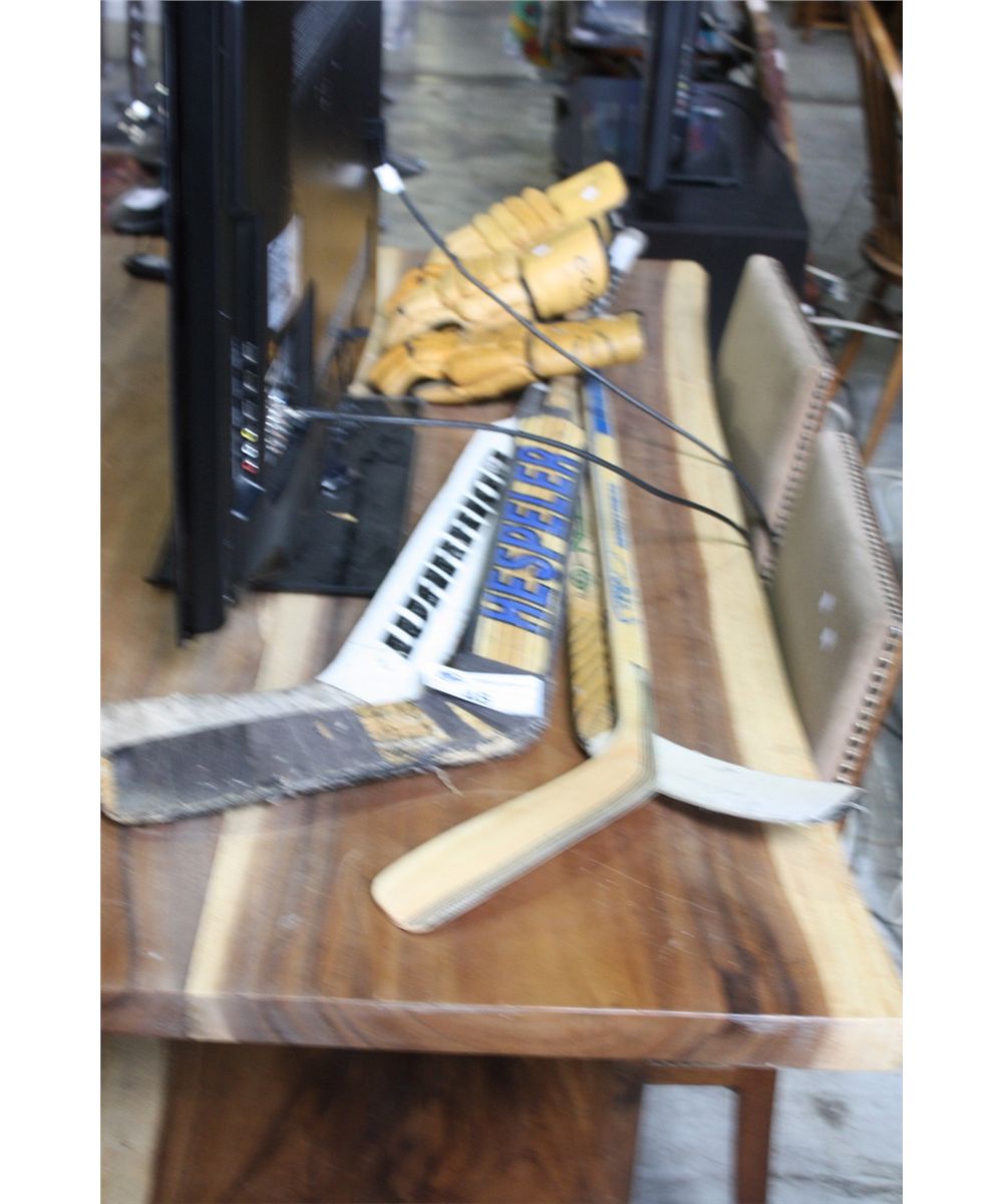 LOT OF 4 HOCKEY STICKS AND 2 SETS OF HOCKEY GLOVES