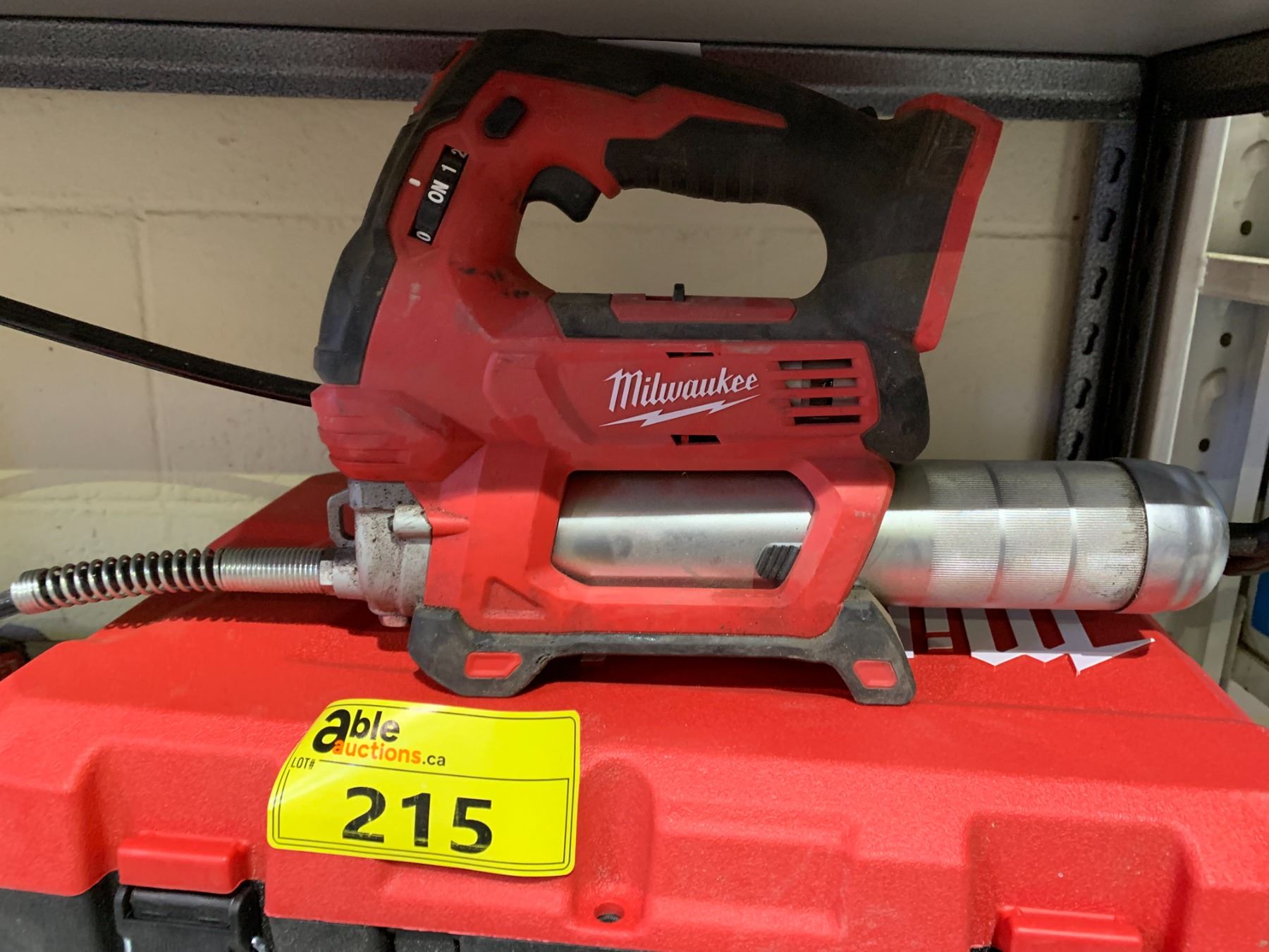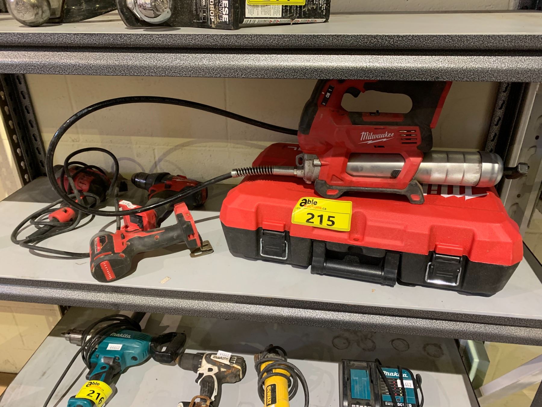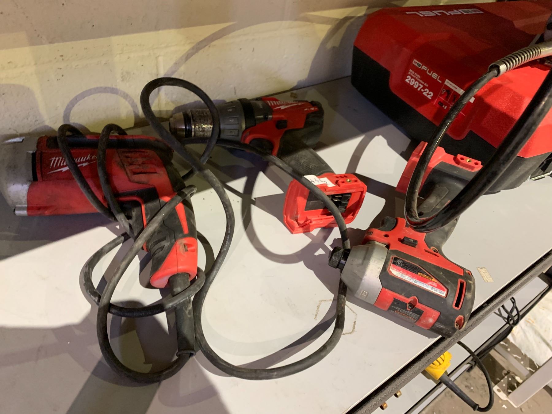 LOT OF 4 MILWAUKEE TOOLS; GREASE GUN AND 3 DRILLS