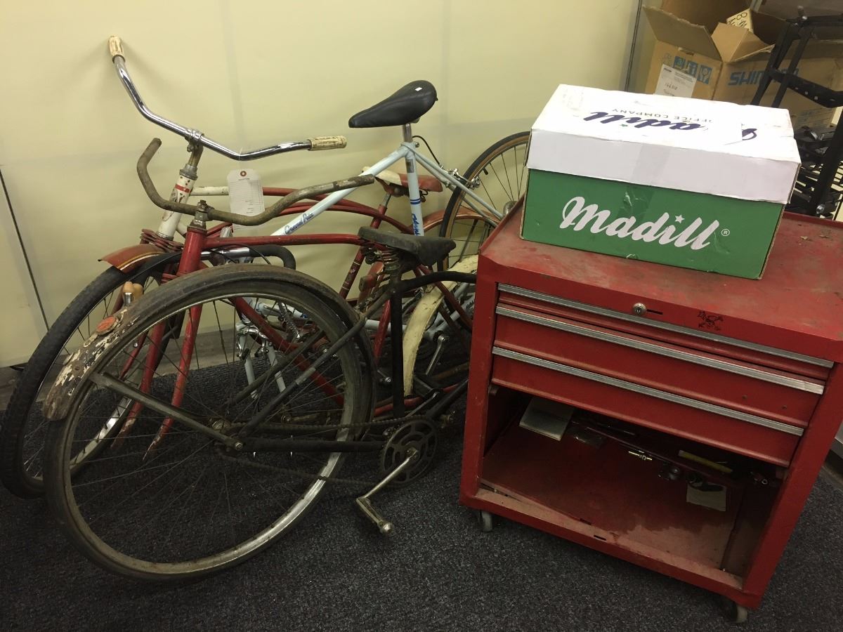 LOT OF 4 VINTAGE BIKE FRAMES & RED TOOLCHEST