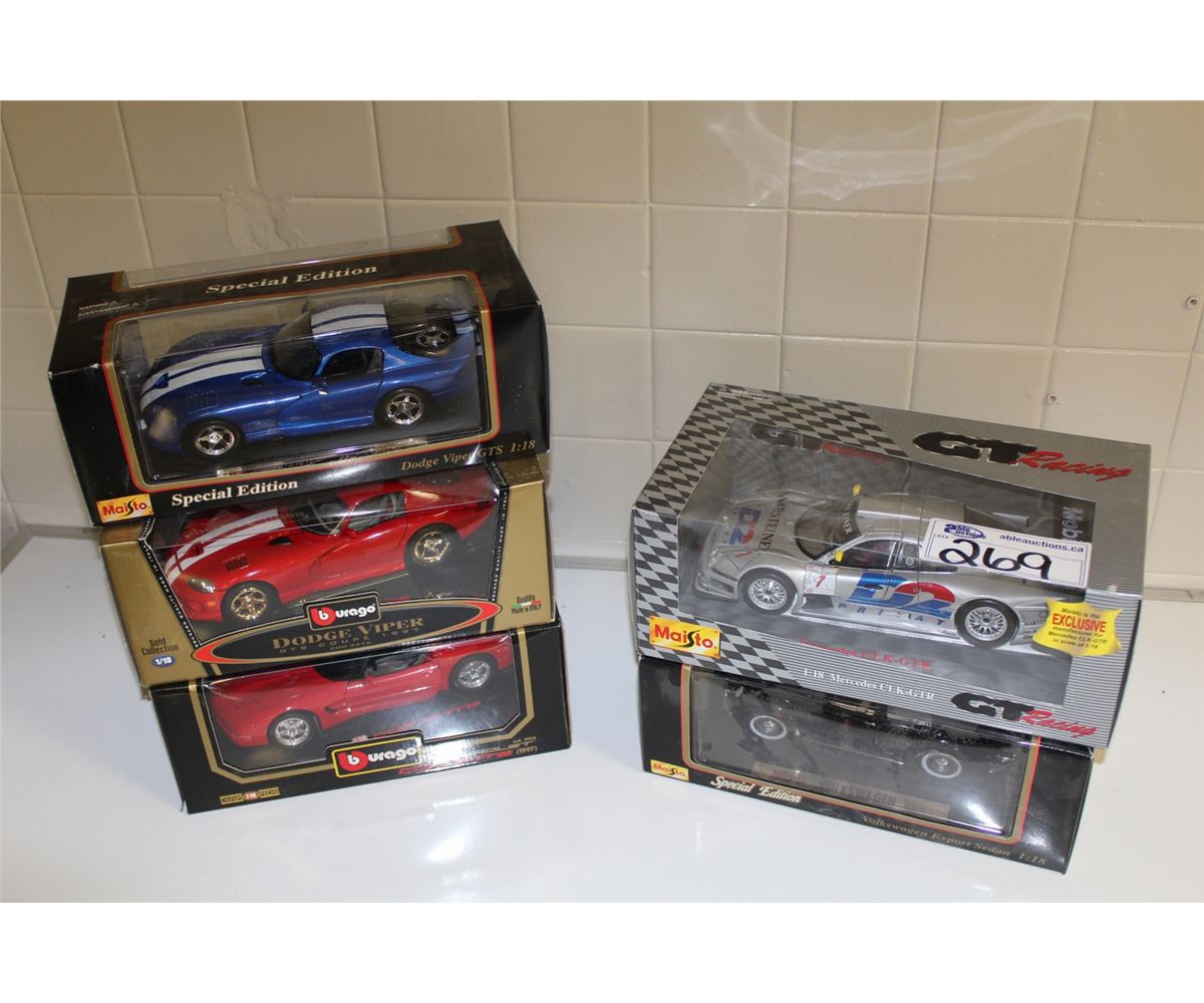 LOT OF 5- 1:18 SCALE DIE CAST AUTOMOBILES NEW IN BOX INCLUDING MERCEDE CLK-GTR, VOLKSWAGEN EXPORT SEDAN, 1997 DODGE VIPER, 1997 CHEVROLET CORVETTE