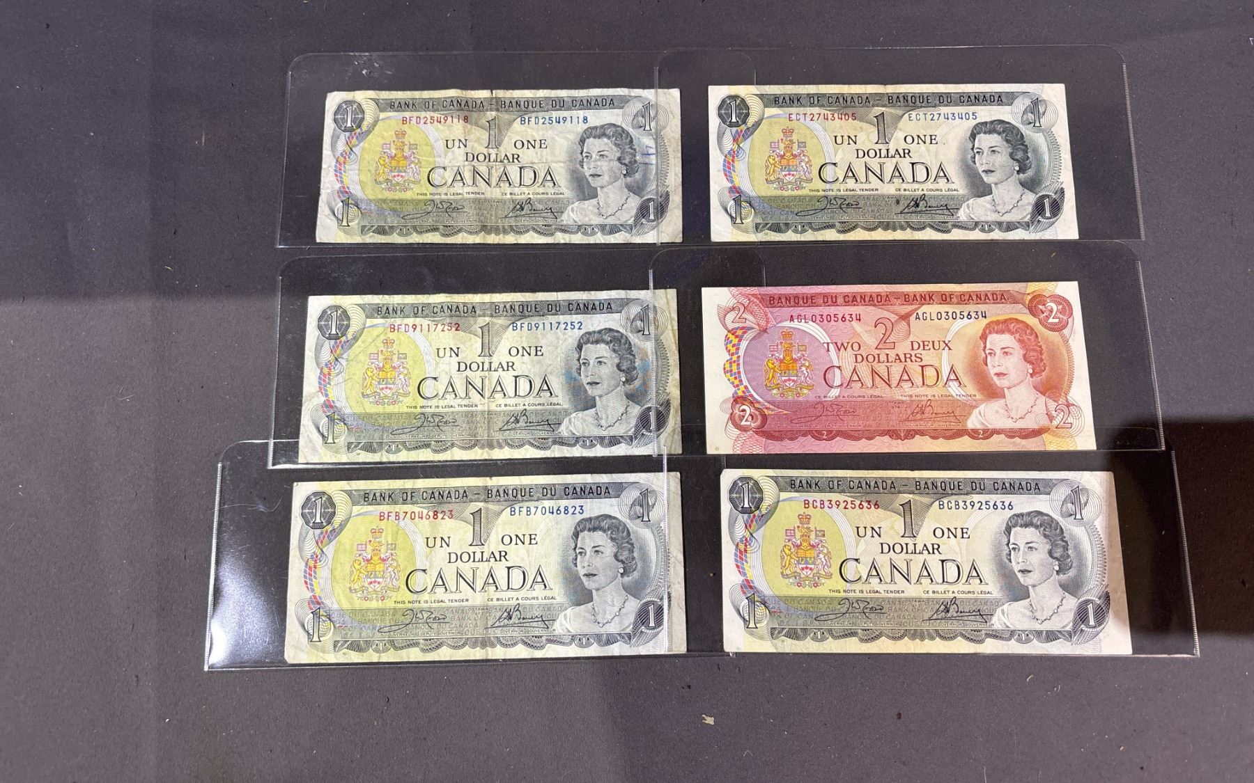 LOT OF 5 $1 CANADIAN BANK NOTES & 1 $2 CANADIAN BANK NOTE