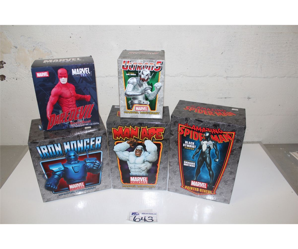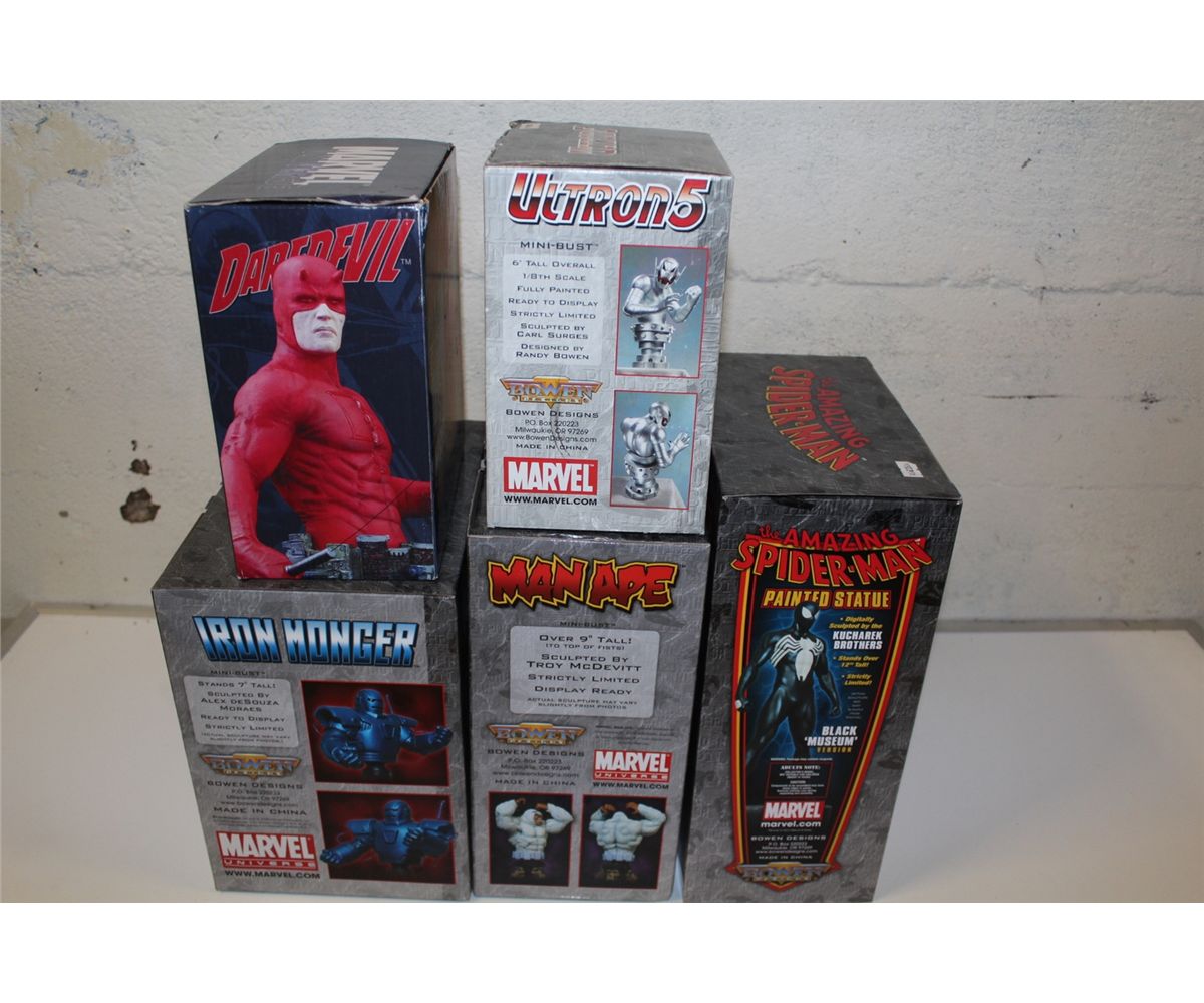 LOT OF 5 ASSORTED MARVEL SUPER HERO LIMITED EDITION COLECTABLES. INCLUDES: DAREDEVIL RESIN BUST, MAN APE, ULTRON5, IRON MONGER MINI BUST AND THE AMAZING SPIDER-MAN BLACK MUSEUM VERSION STATUE