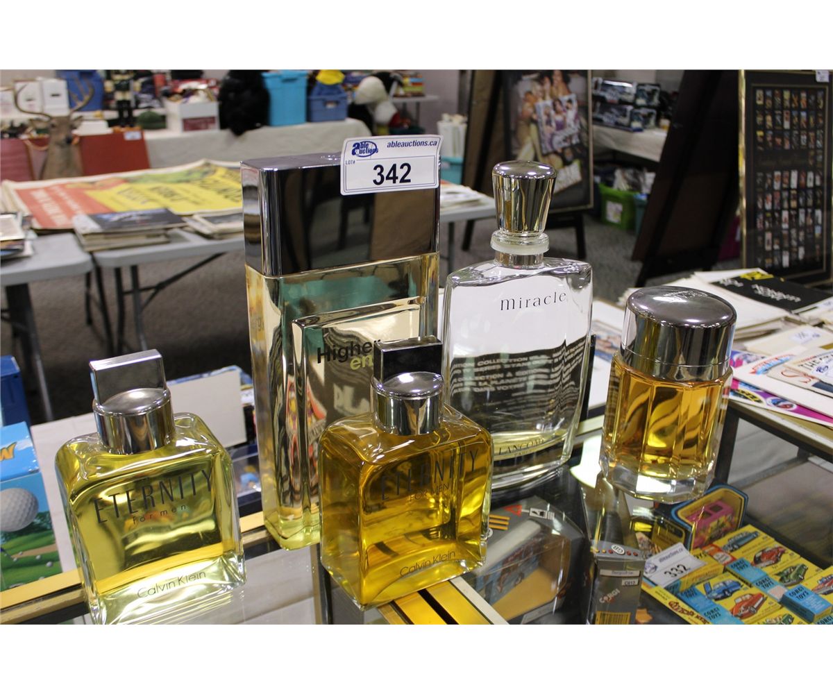 LOT OF 5 GIANT FACTICE PERFUME DISPLAY BOTTLES (FILLED WITH COLOUR WATER FOR DISPLAY)