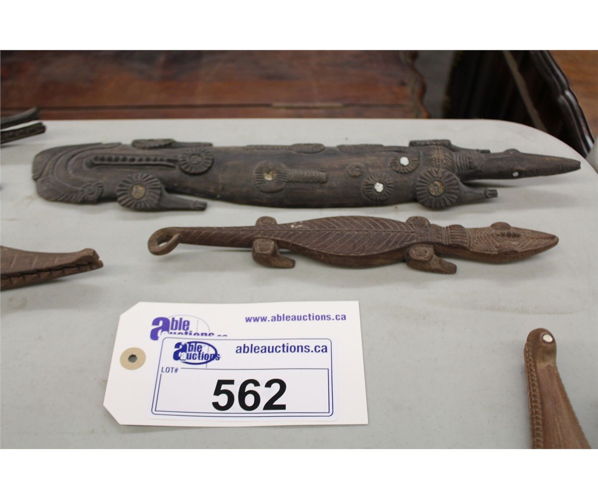 LOT OF 5 HAND CARVED WOODEN CROCODILES, ONE WITH MOTHER OF PEARL EYES