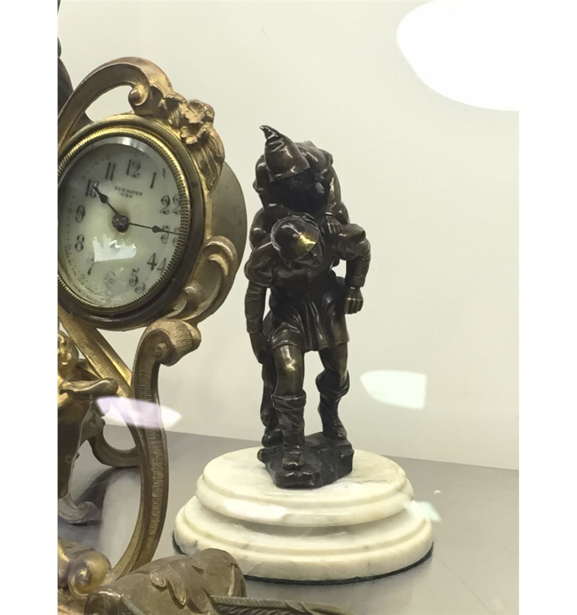 LOT OF 5 SMALL COLLECTABLES INCL. VICTORIAN CLOCK, SEWING BIRD, ELEPHANT BANK AND SCULPTURE