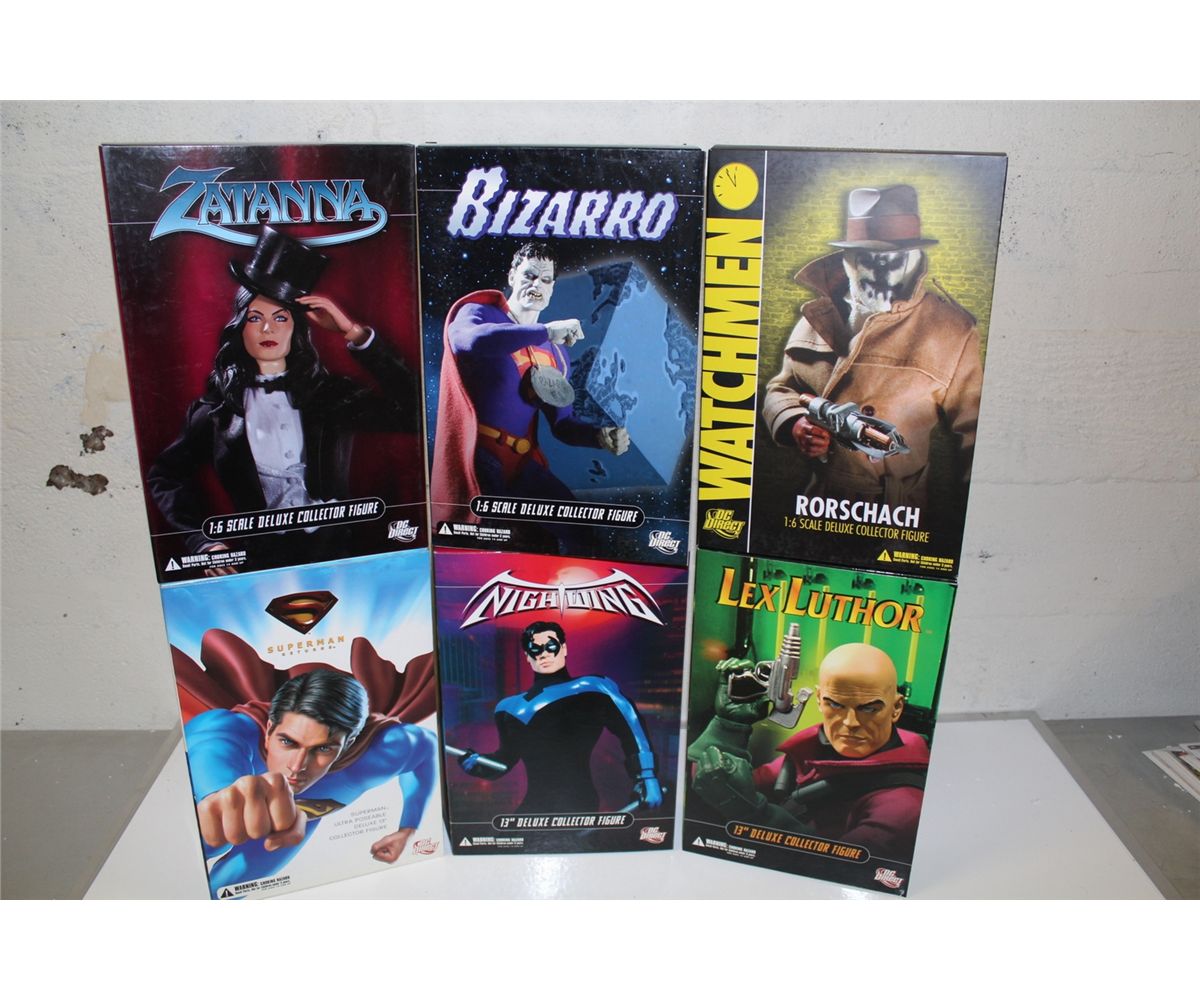 LOT OF 6 ASSORTED 1:6 SCALE COLLECTOR FIGURES, NEW IN BOX. INCLUDES, NIGHTWING, LEX LUTHOR, BIZARRO, SUPERMAN, ZATANNA AND RORSCHACH