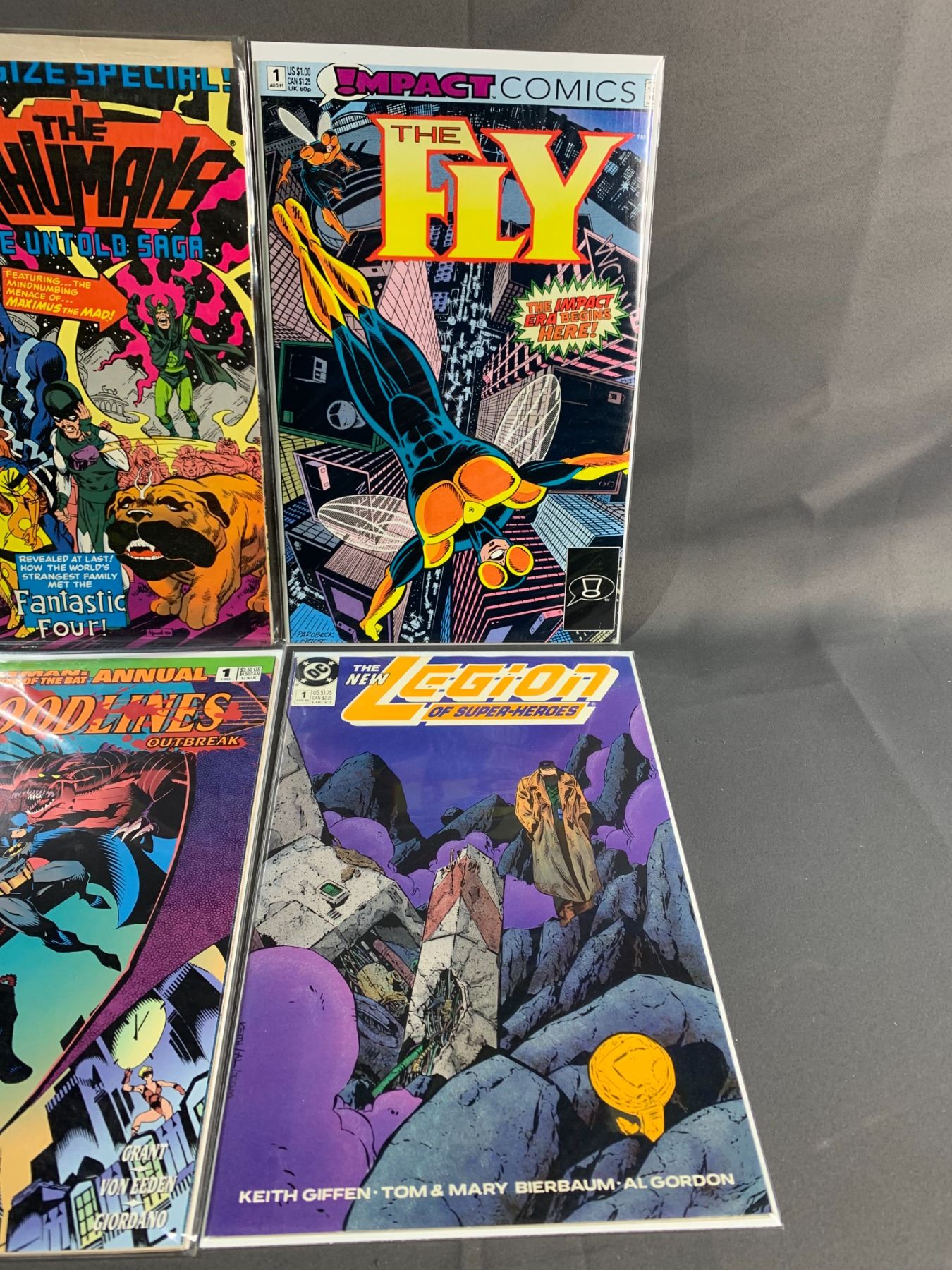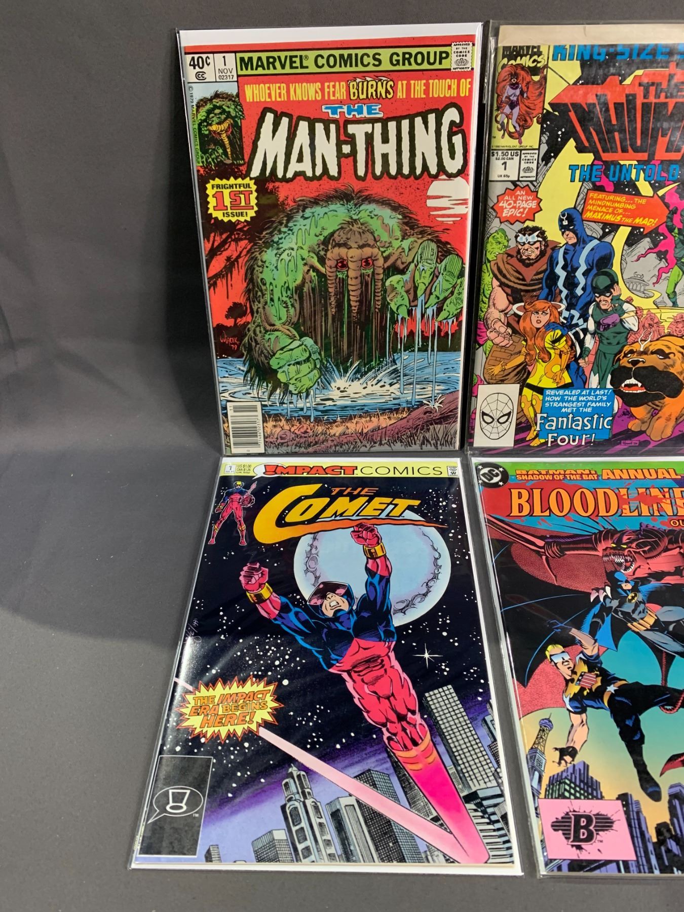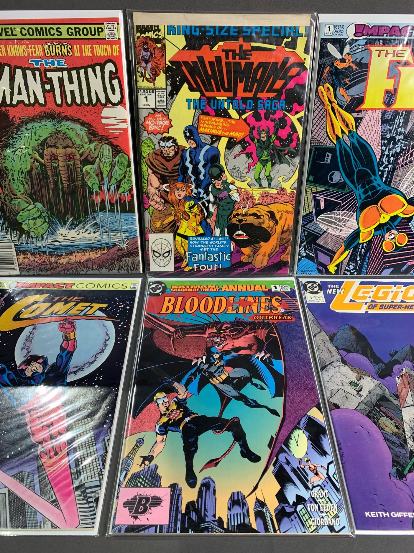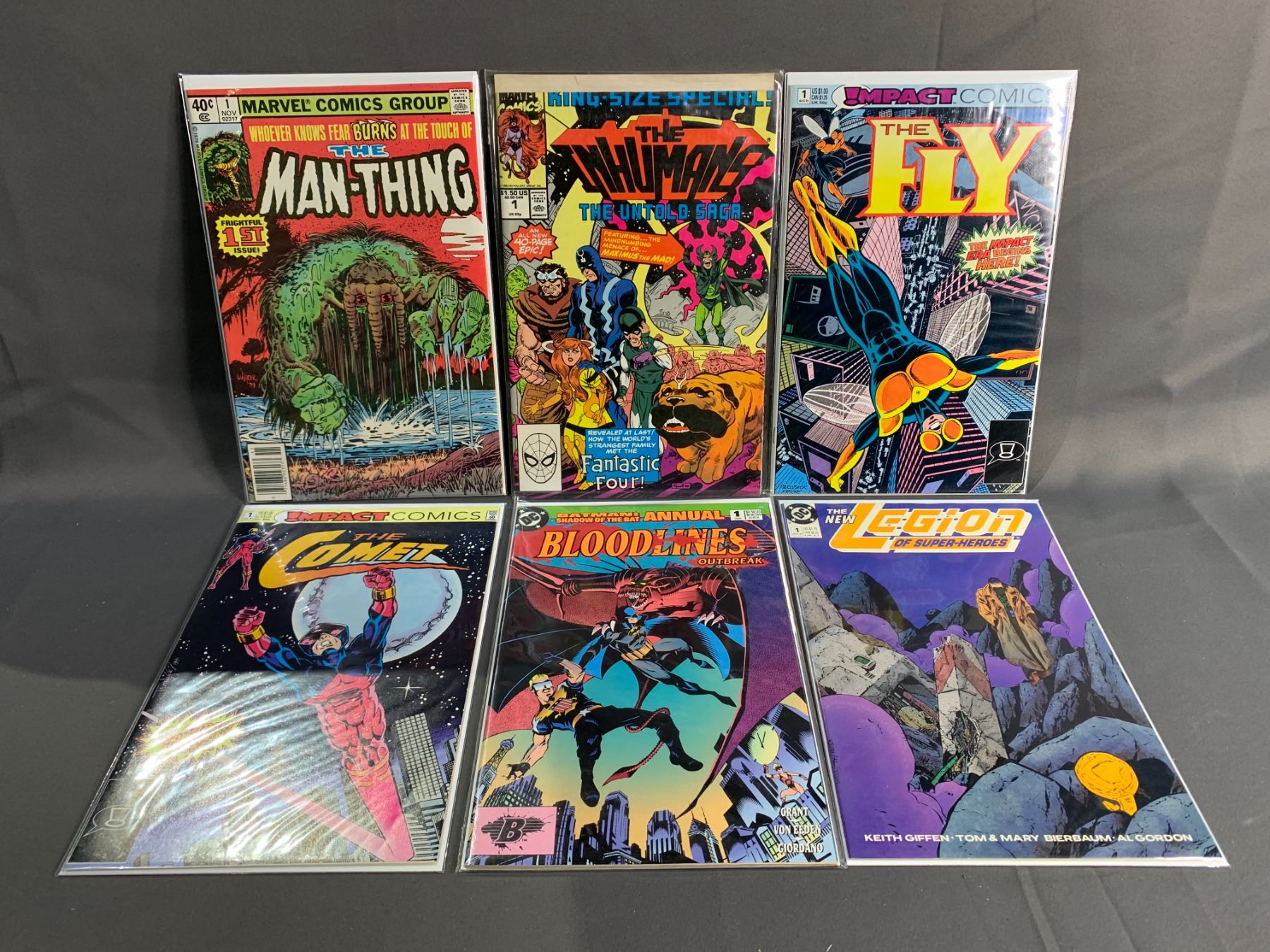LOT OF 6 ASSORTED HIGH GRADE #1 COMIC BOOKS INCLUDING; MARVEL THE MAN-THING, IMPACT THE FLY, DC BLOODLINES OUTBREAK & MORE