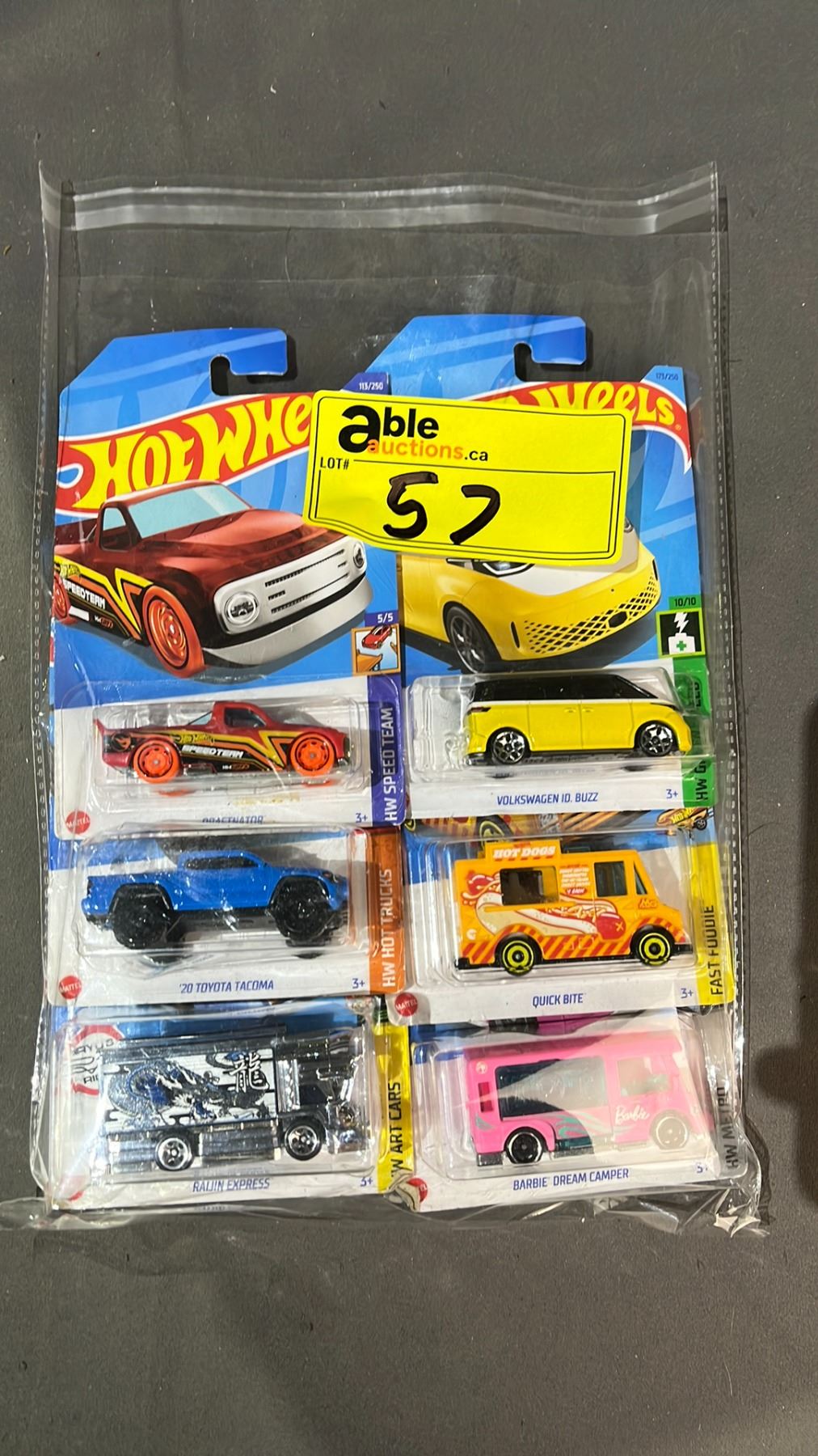 LOT OF 6 ASSORTED HOT WHEELS MODEL CARS INCLUDING; RAIJIN EXPRESS, VOLKSWAGEN ID. BUZZ, BARBIE