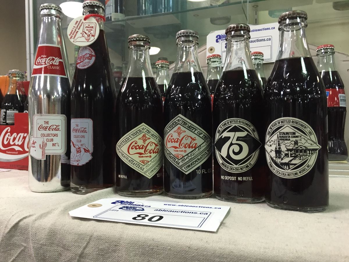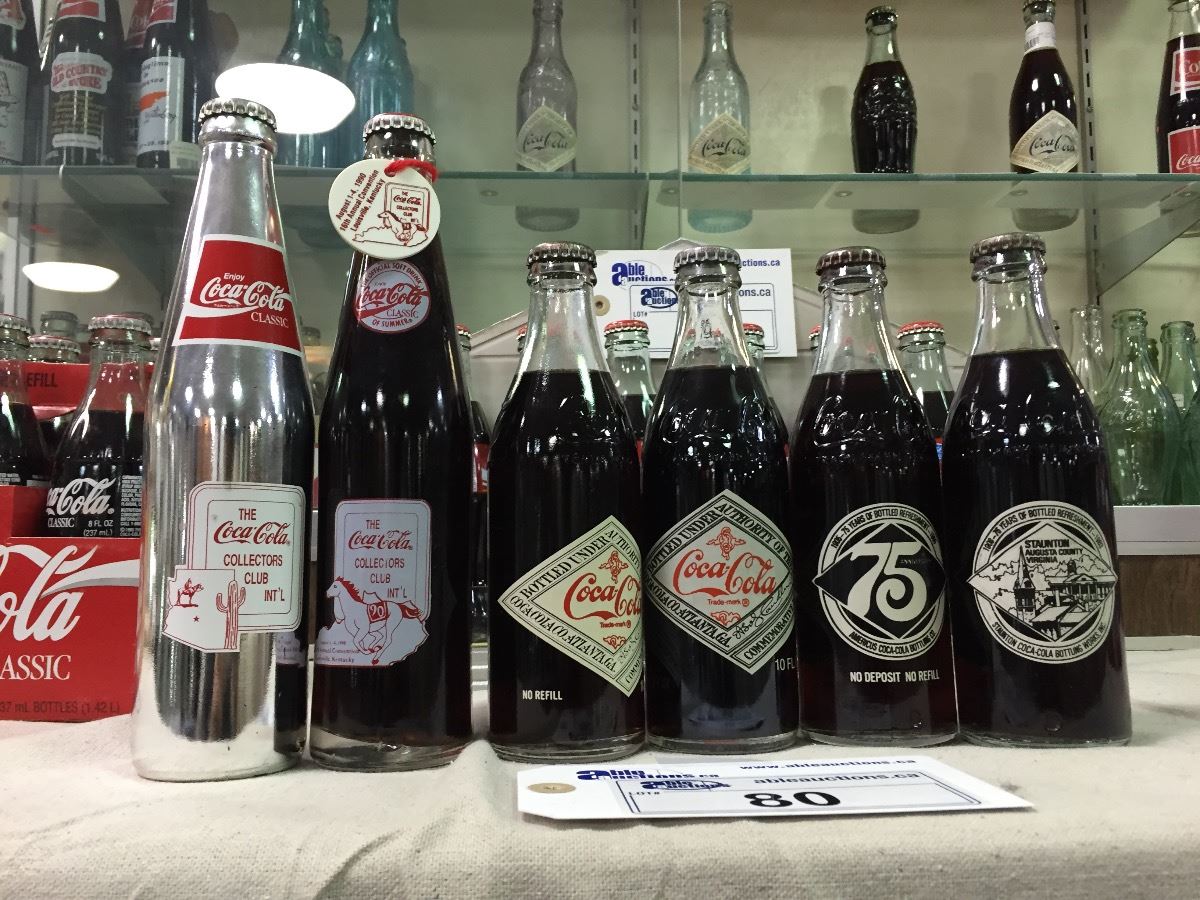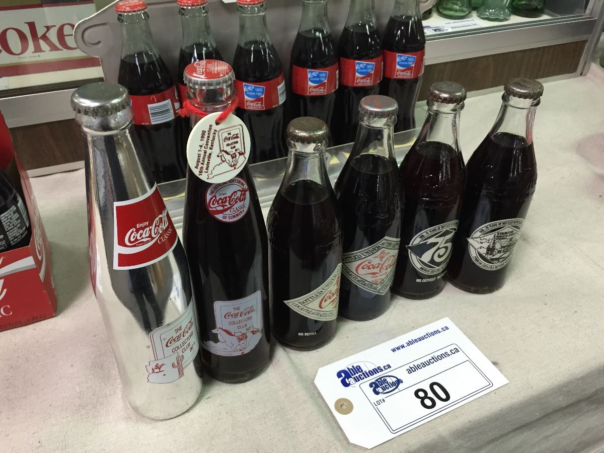 LOT OF 6 COLLECTABLE COCA-COLA BOTTLES INCLUDING "THE COLLECTOR'S CLUB INTERNATIONAL", "KROGER 100TH ANNIVERSARY", "75 YEARS OF BOTTLED REFRESHMENTS" AND MORE