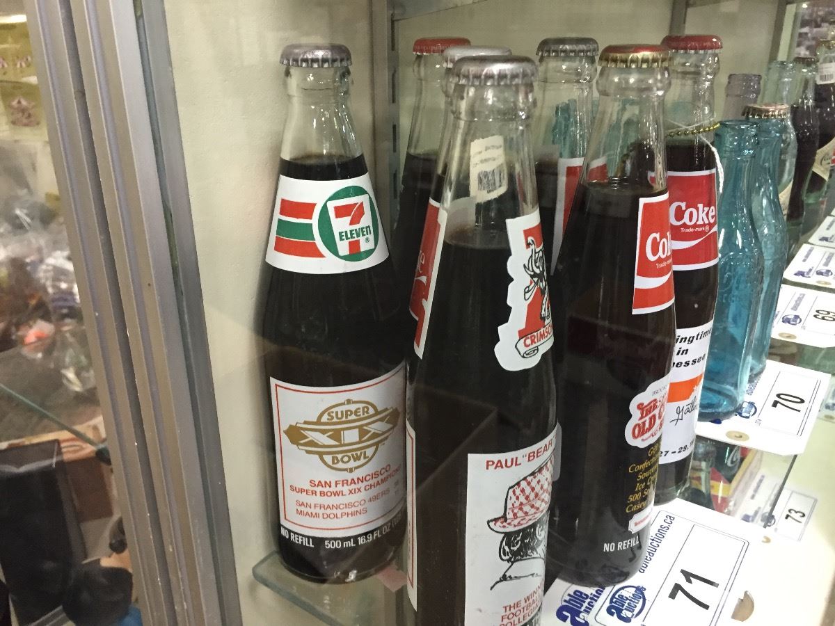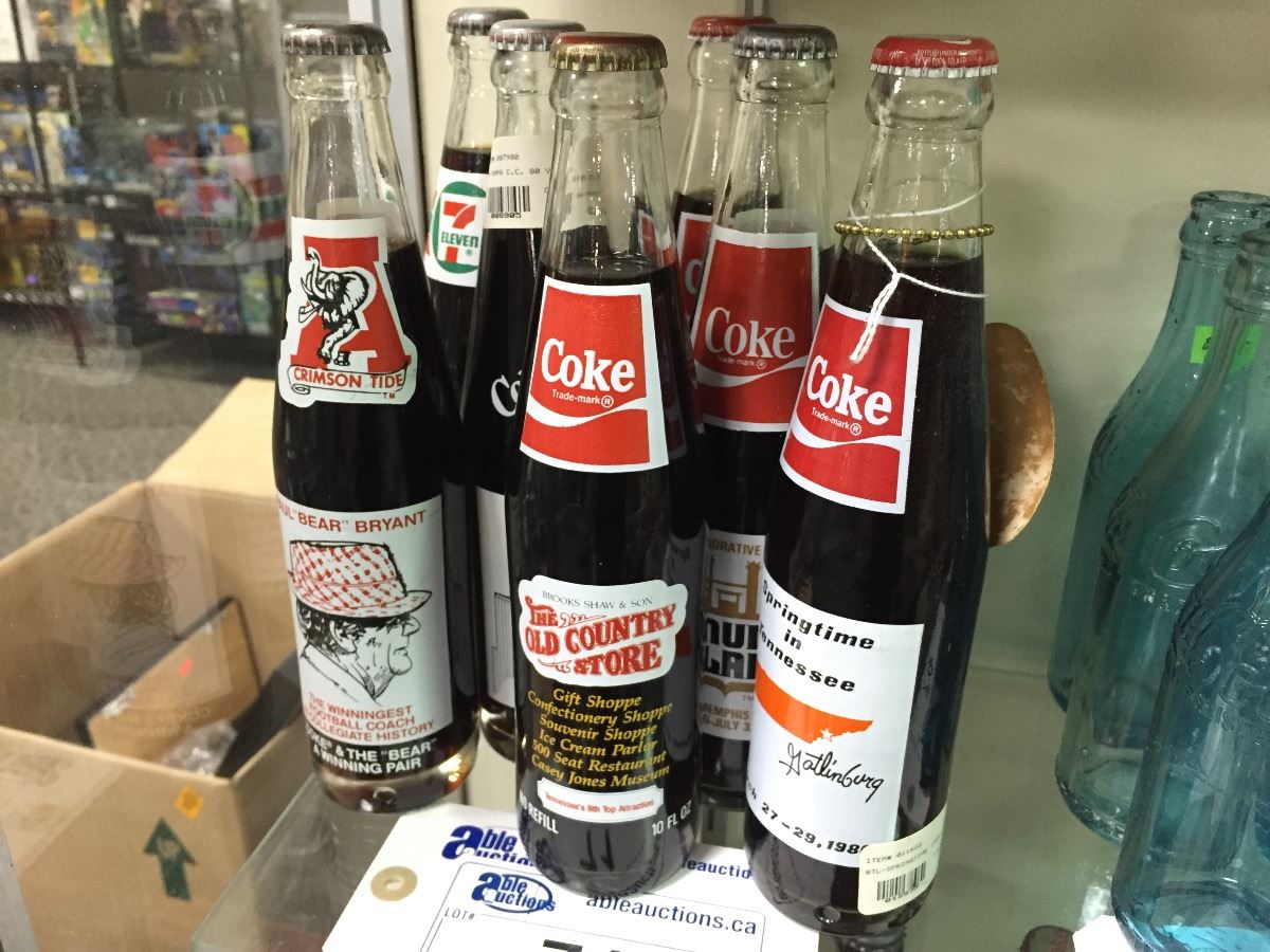 LOT OF 7 COCA-COLA COLLECTORS BOTTLES FROM 1970'S & 80'S INCLUDING SAN FRANCISCO SUPER BOWL CHAMPIONS XIX ,80 YEARS IN BOTTLING & MORE