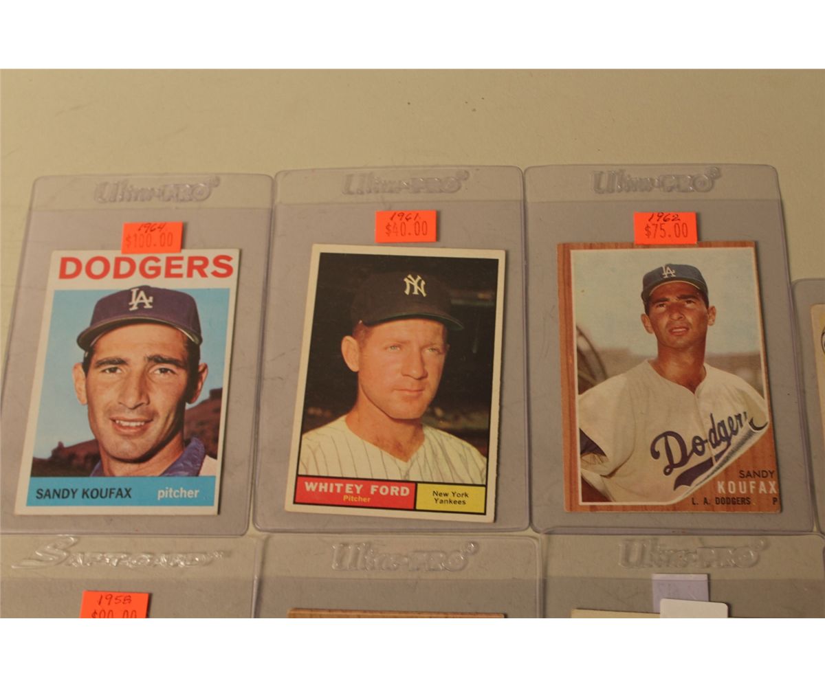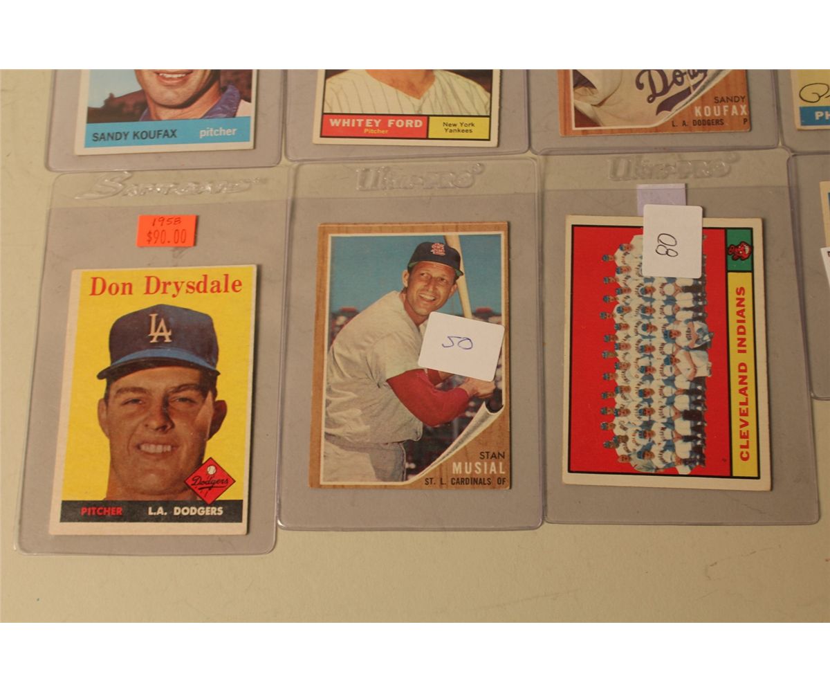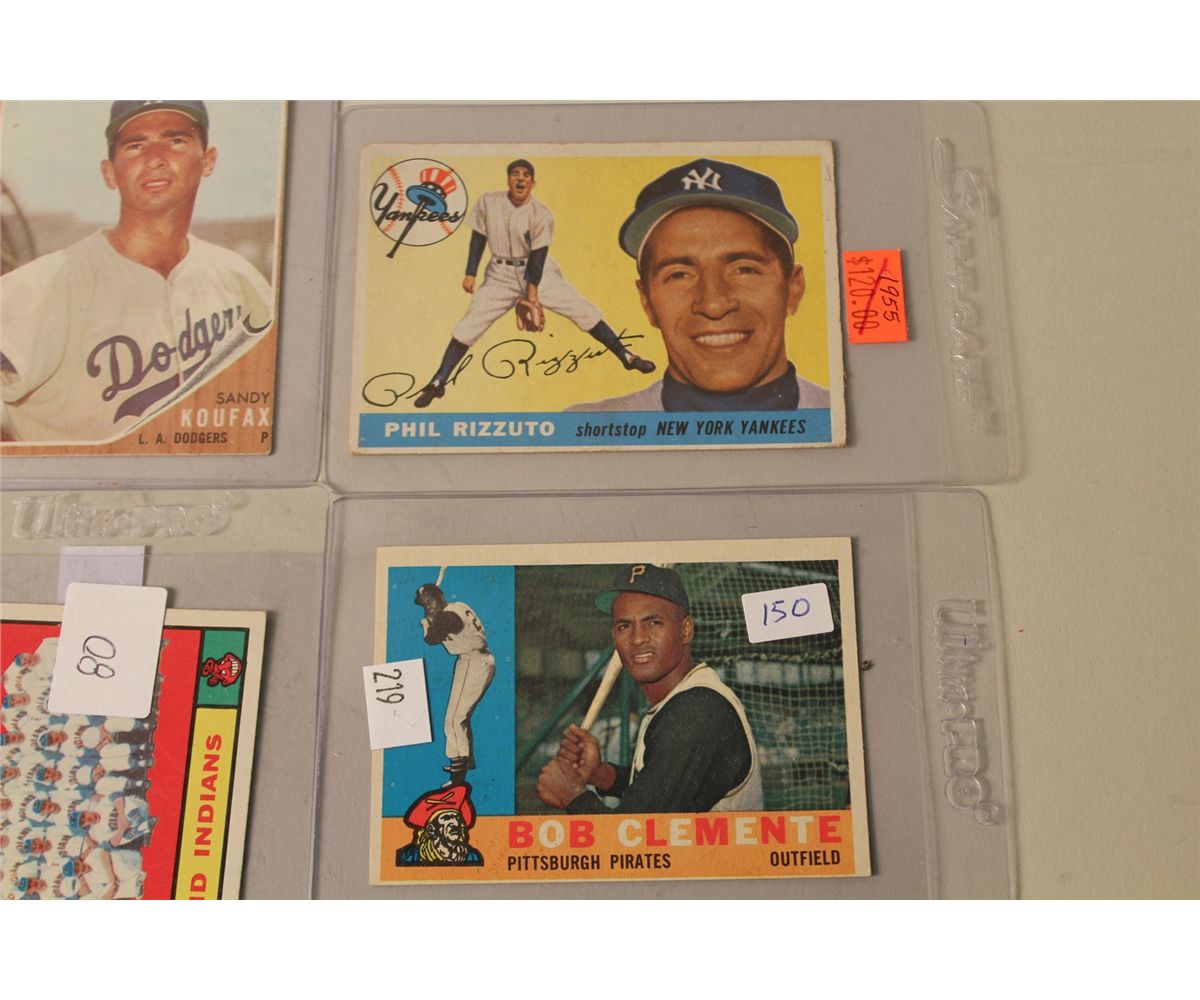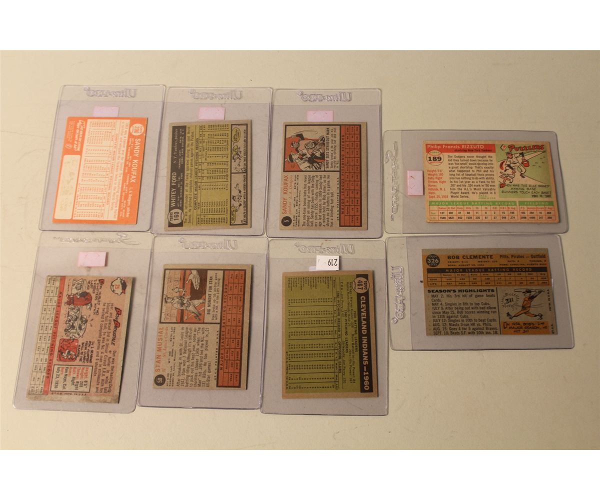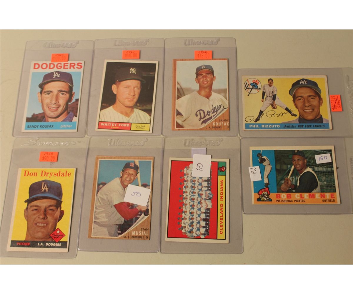 LOT OF 8 BASEBALL CARDS INCL. BOB CLEMENTE, PHIL RIZZUTO, STAN MUSIALDON DRYSDALE, SANDY KOUFAX AND MORE!