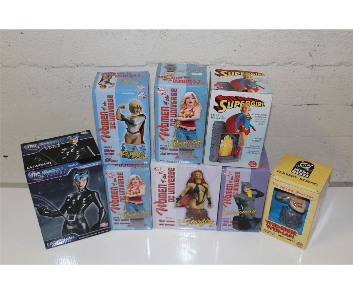 LOT OF 8 FEMALE DC SUPER HERO LIMITED EDITION STATUES AND BUSTS INCLUDING: SUPERGIRL, WONDER X2, GIRLWONDER WOMAN, STARFIRE, CATWOMAN X2 & POWER GIRL. NEW IN BOX.