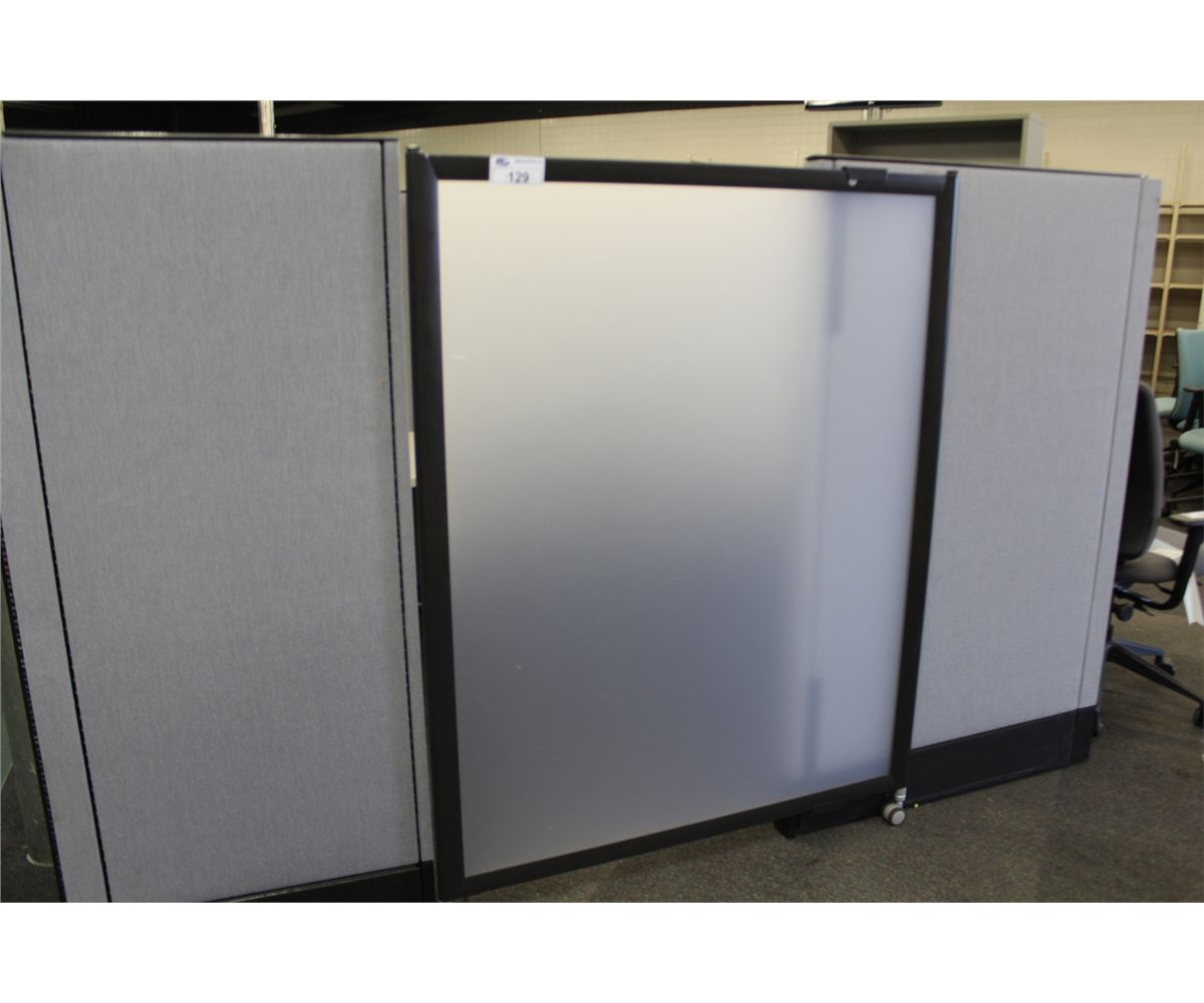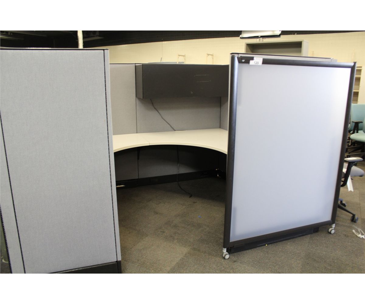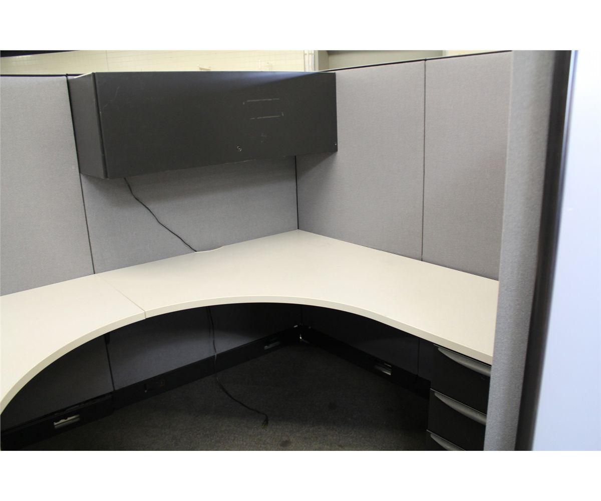 LOT OF 8 HAWORTH PREMISE GREY U-SHAPE SELF CONTAINED WORKSTATIONS WITH SLIDING PRIVACY DOORS