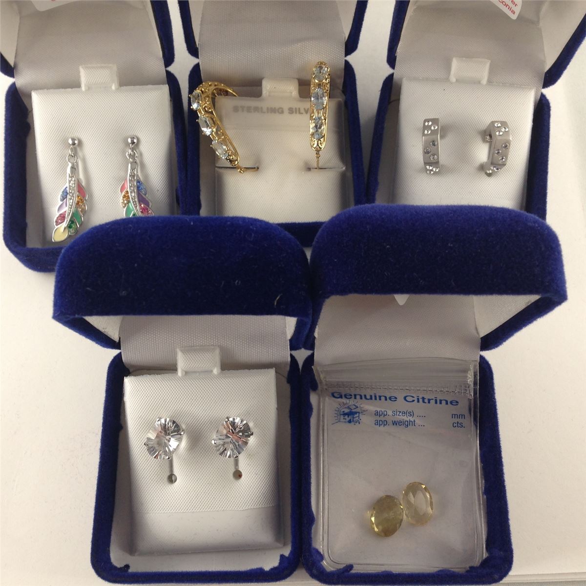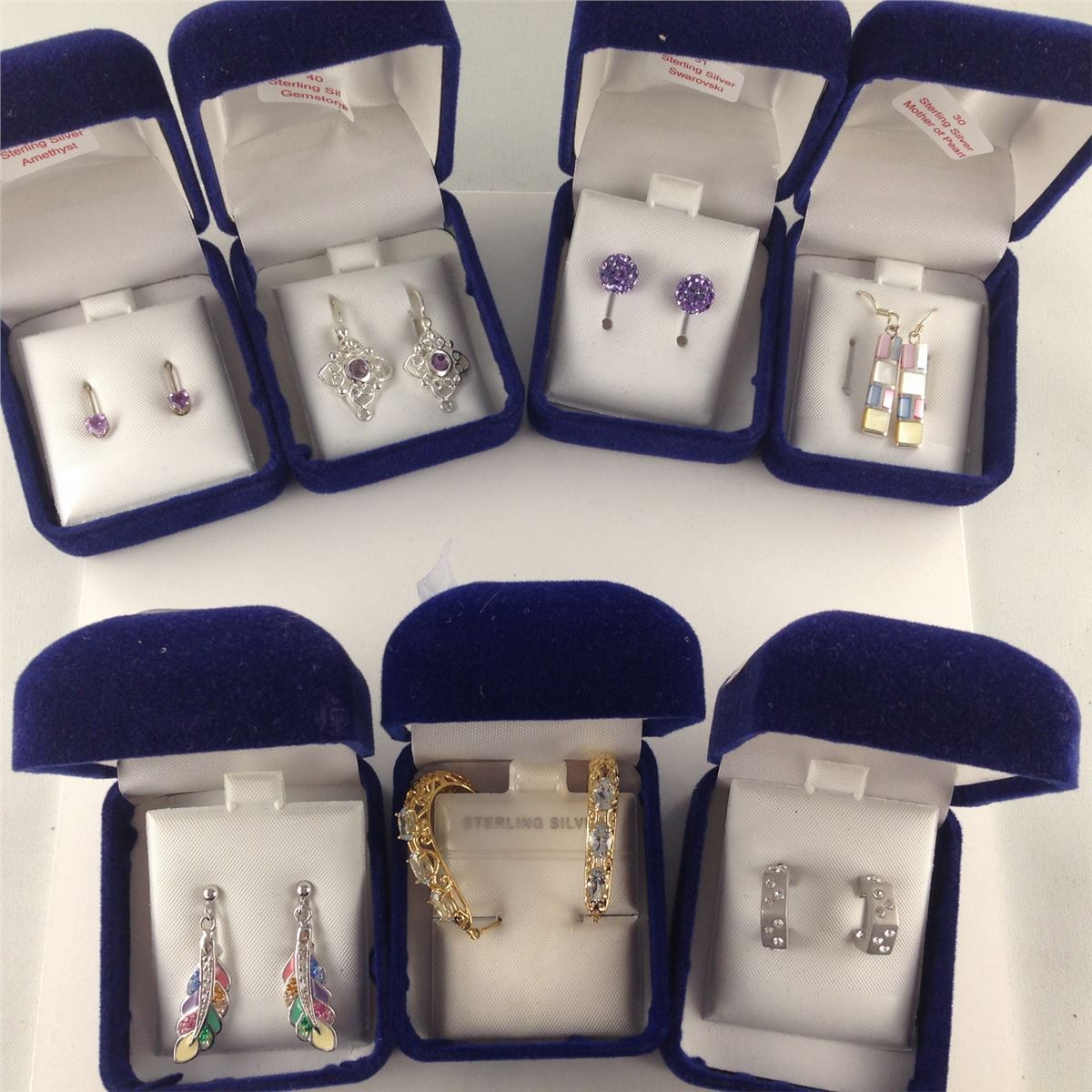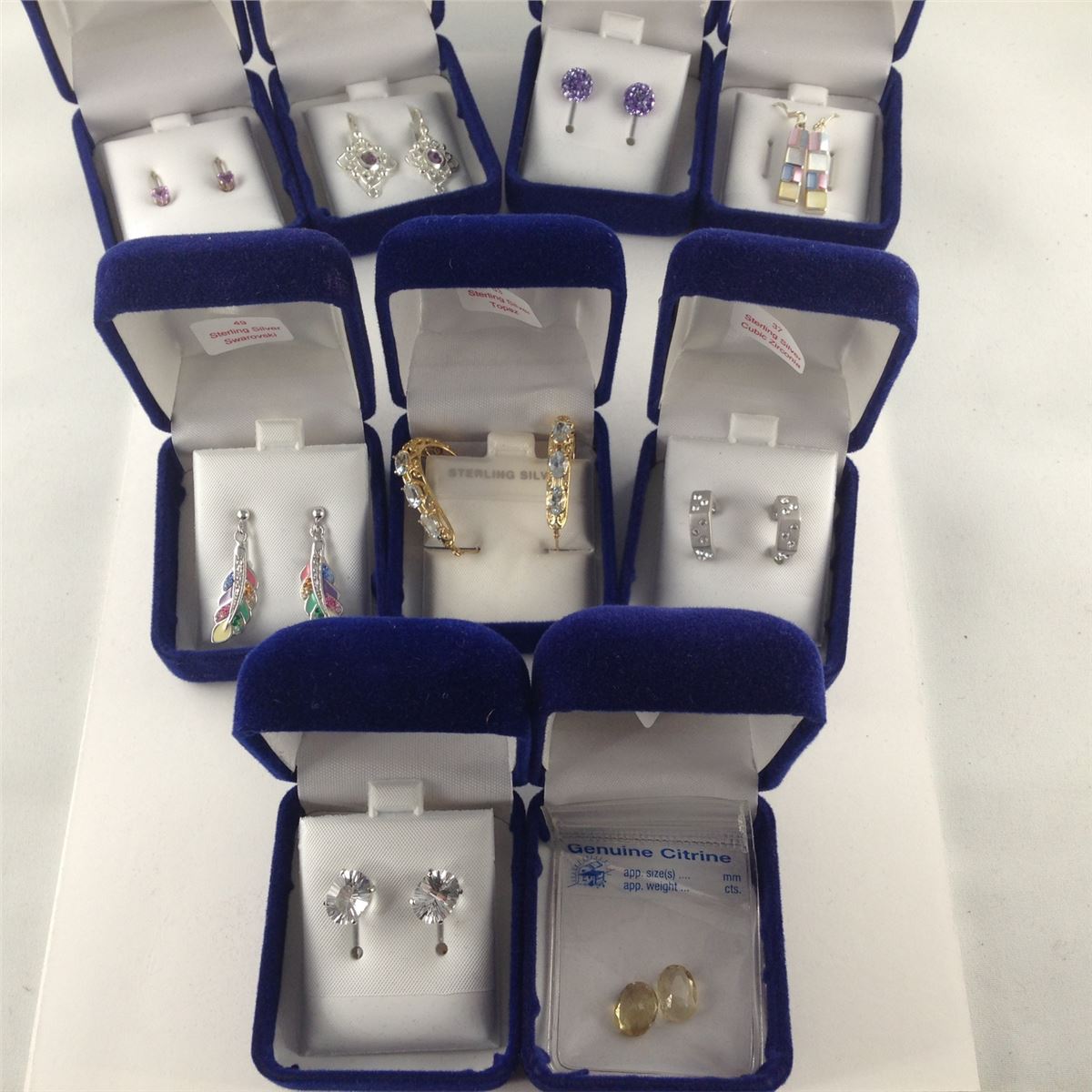 LOT OF 9 PAIRS OF STERLING SILVER EARRINGS, SOME INCLUDING: AMETHYST, SWAROVSKI, TOPAZ, MOTHER OF PEARL, CUBIC ZIRCONIA AND CITRINE! A CHOICE DEALERS LOT!