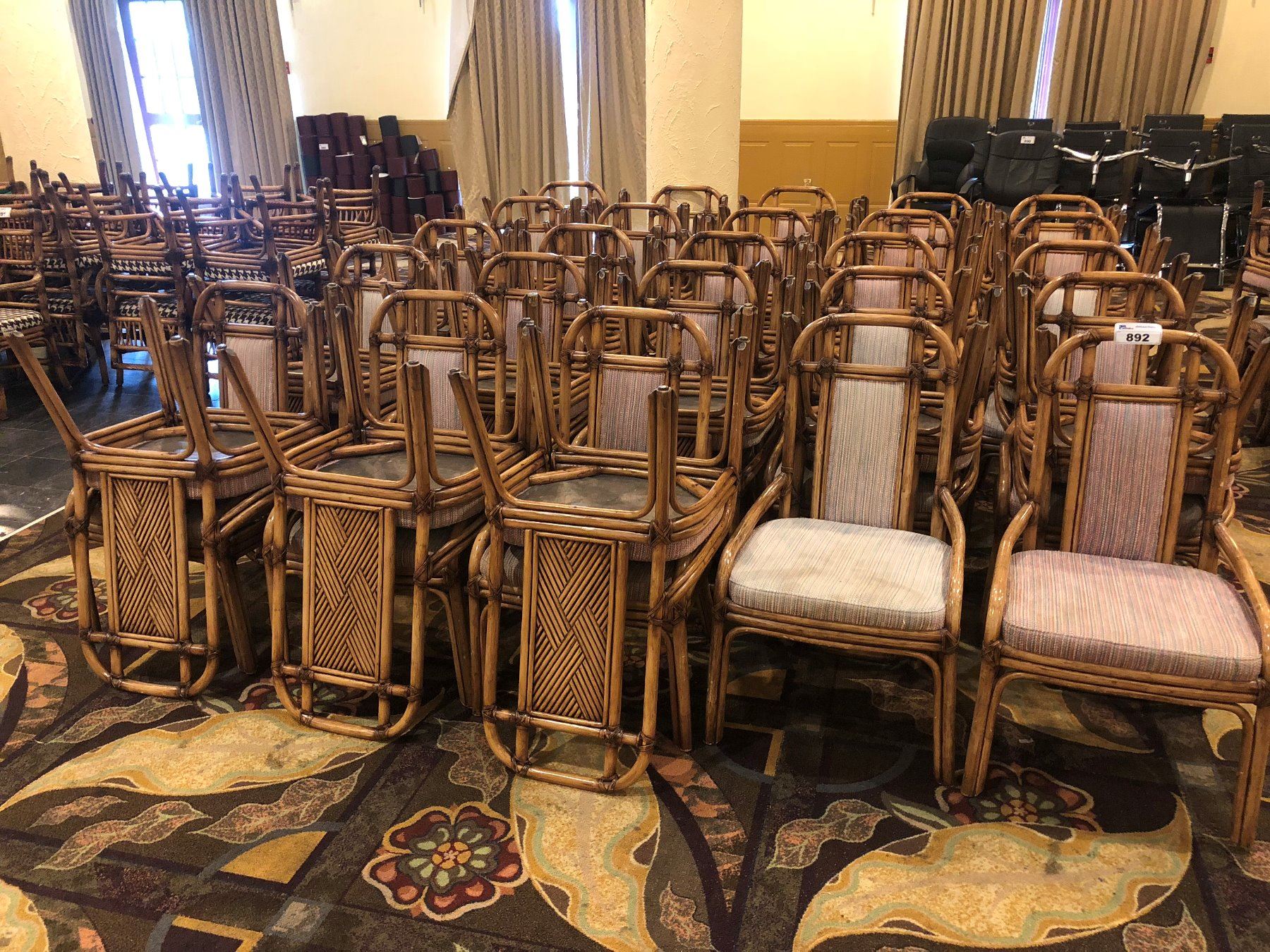 LOT OF APPROX 48 RATTAN CHAIRS, WITH STRIPED PATTERN CUSHIONS