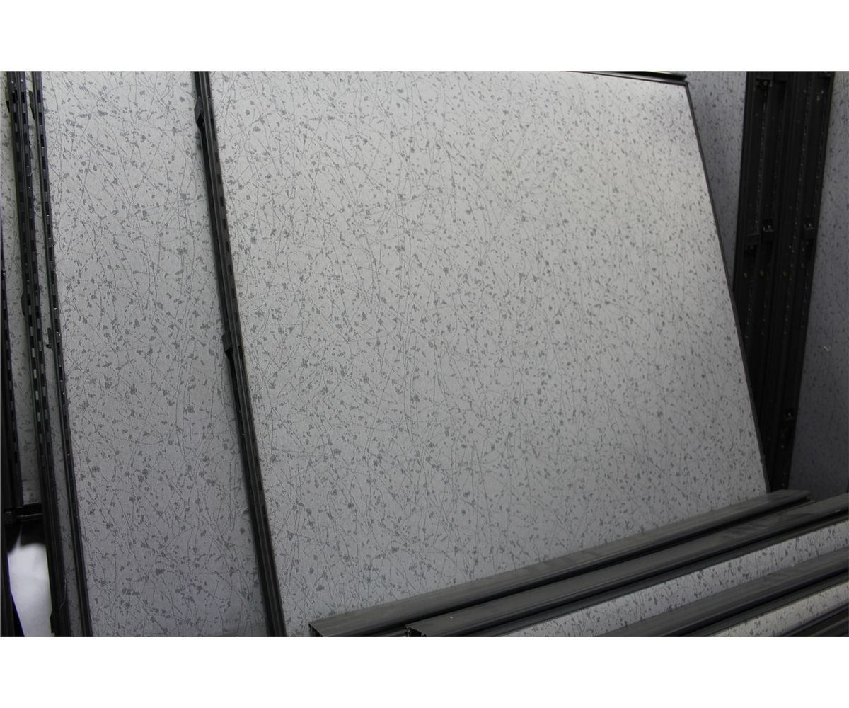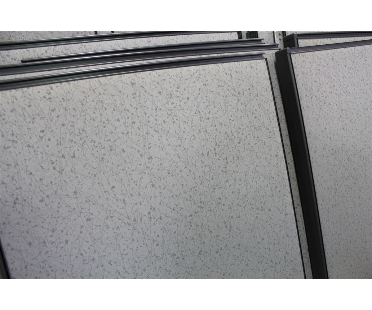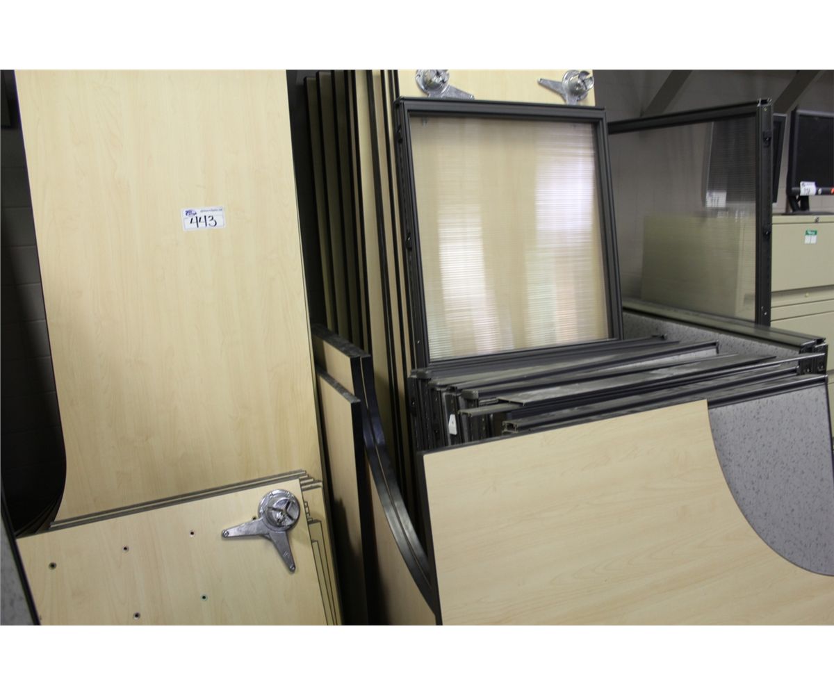 LOT OF APROX. 20 MODULAR OFFICE CUBICLES INCLUDES GREY PANELS AND 6' X 6' MAPLE WORKSURFACES
